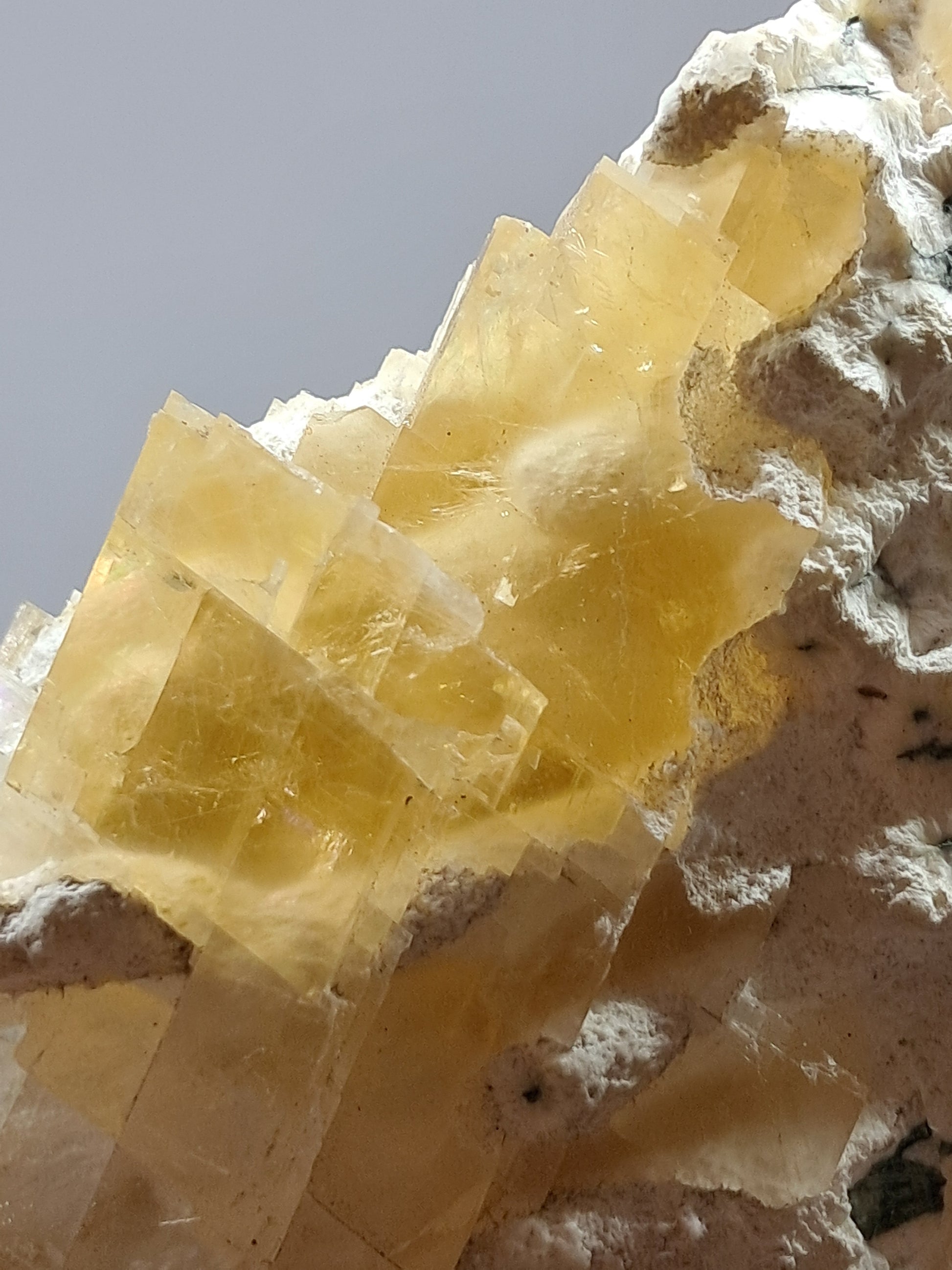 Incredibly lustrous specimen of Honey Calcite from a one off find during construction. The Calcite has grown with Okenite. Some Okenite can be seen on exteriors while some have grown inside the Calcite.