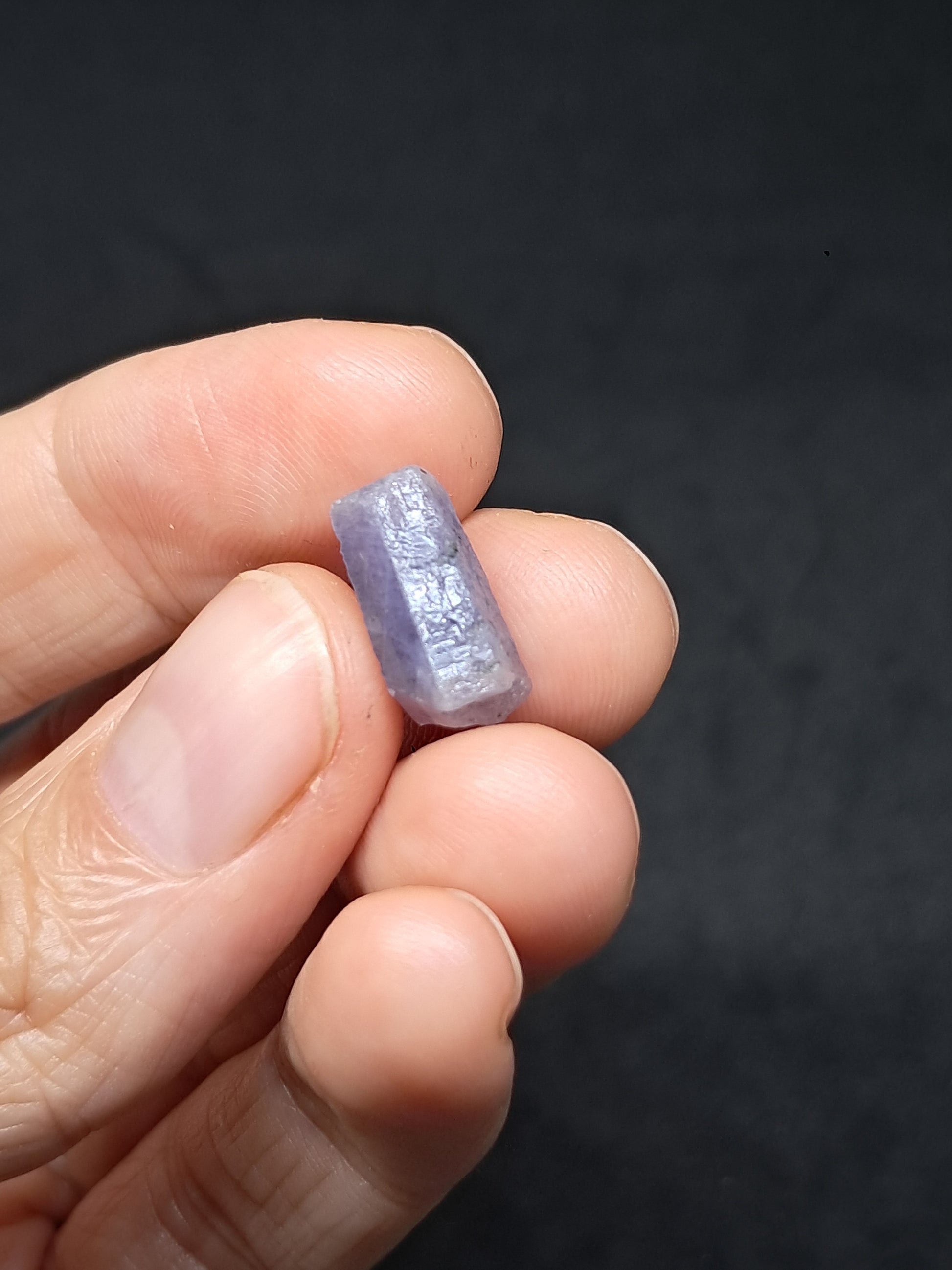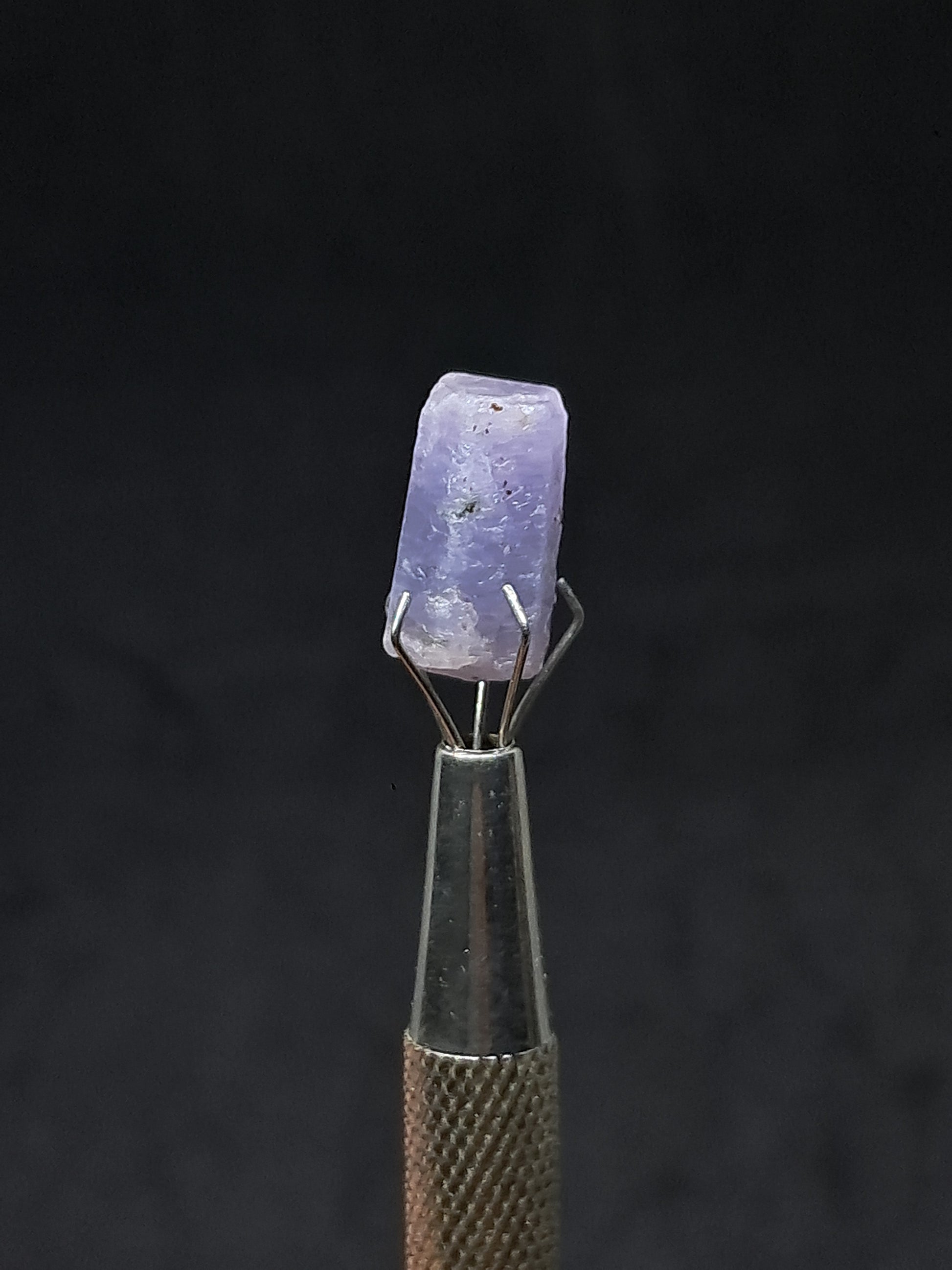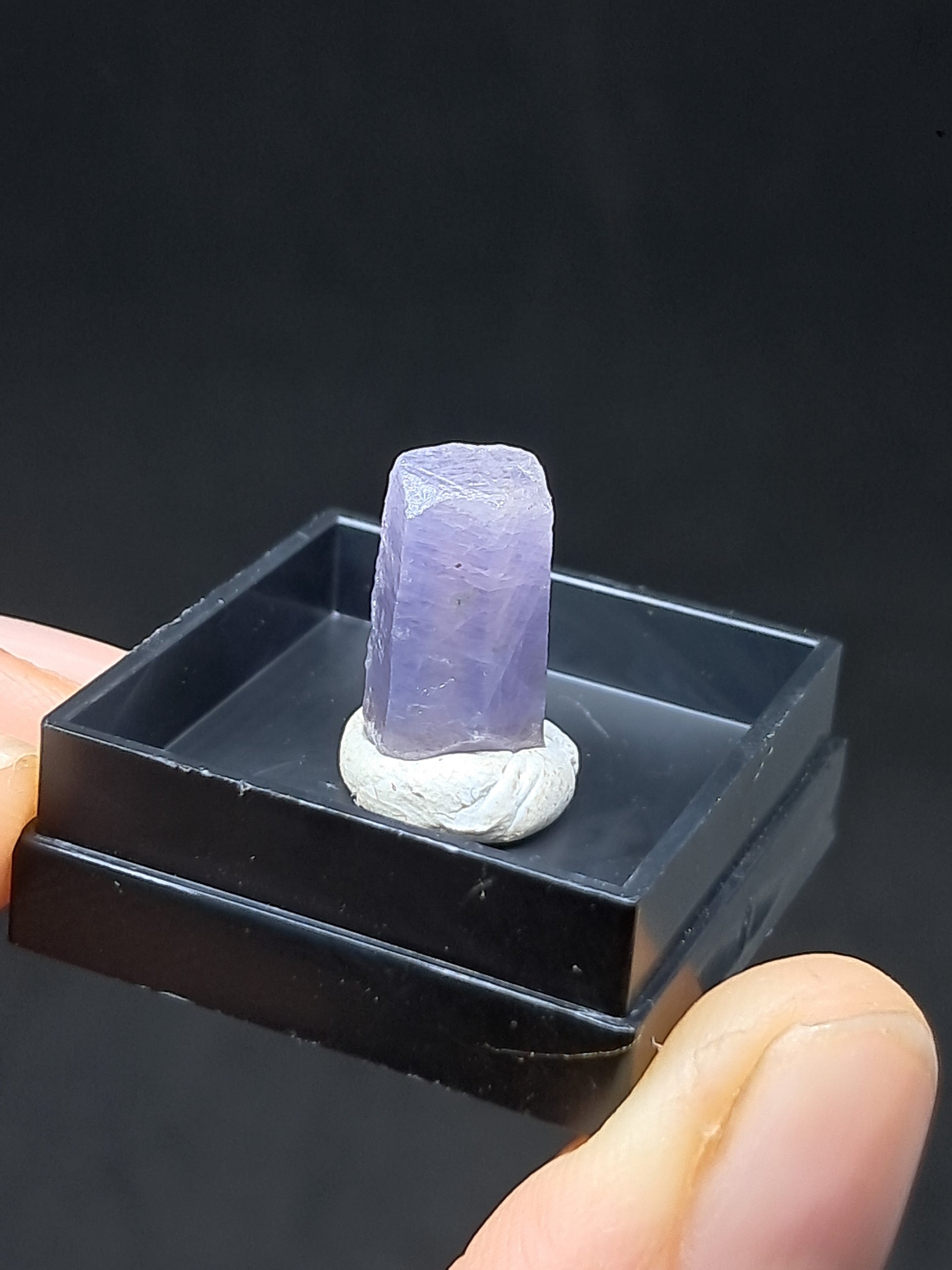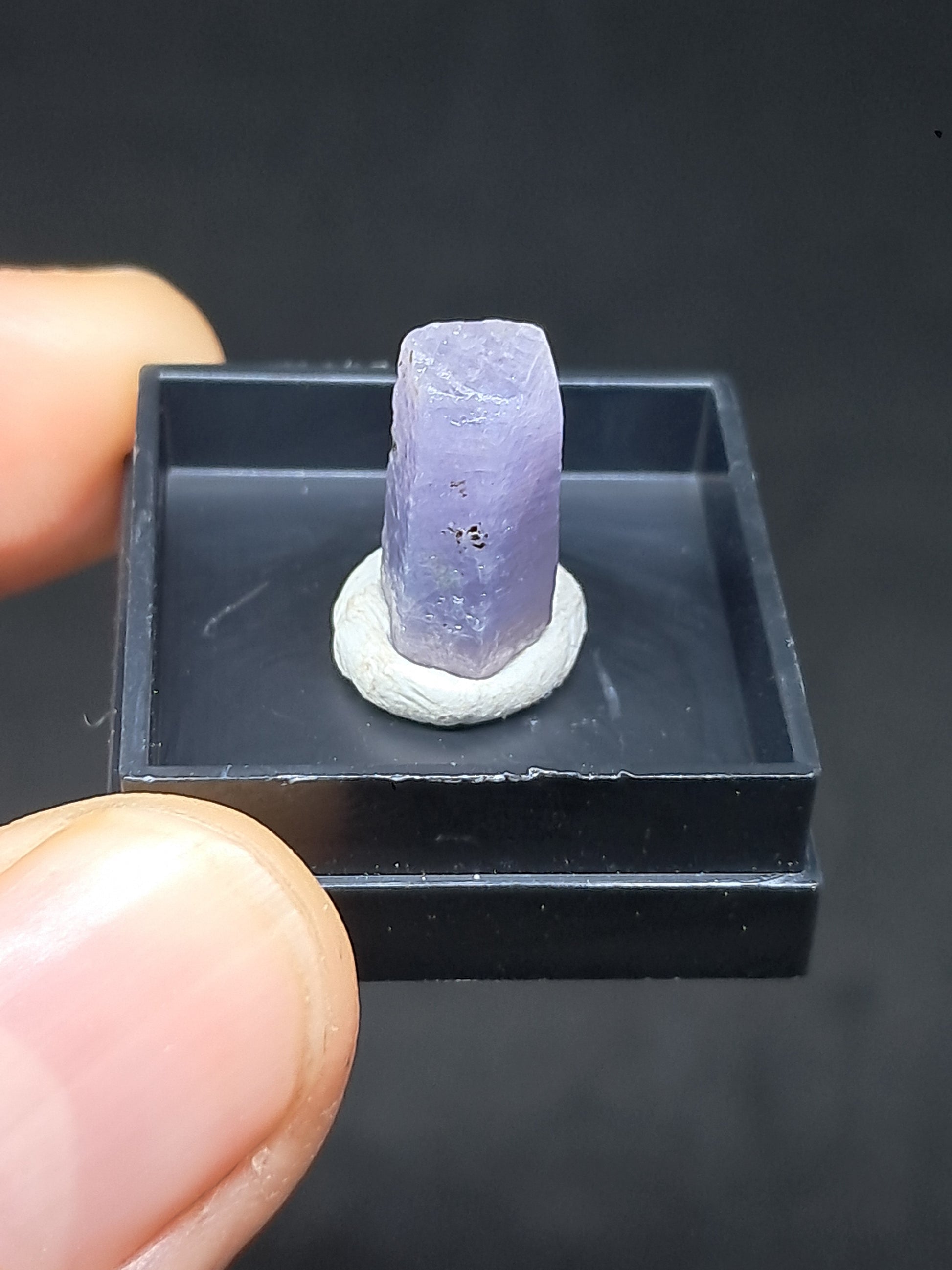 Cristal natural de zafiro lavanda con tono azulado. Montado temporalmente en caja de acrílico (incluida). Gracias a las inclusiones de cromo, el ejemplar brilla con un tono rosa intenso bajo la luz ultravioleta.