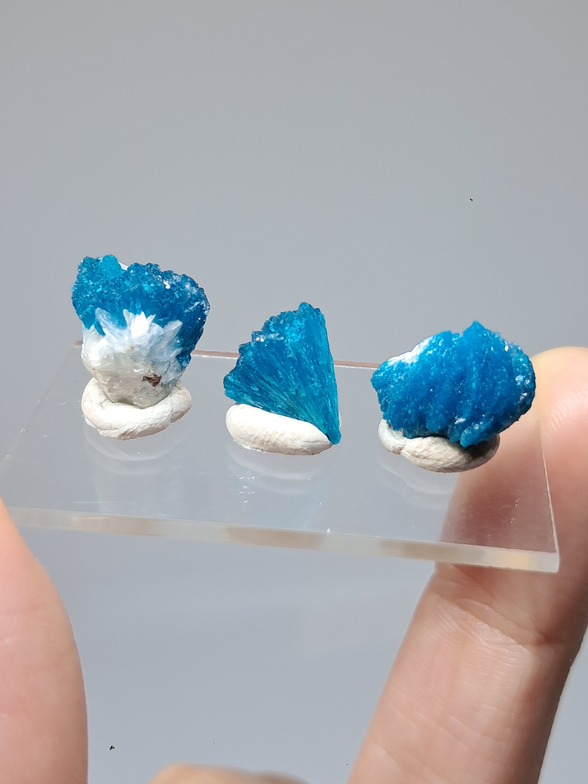 Tres hermosos ejemplares de cavansita. Uno crece junto a cristales blancos de estilbita, y el otro presenta okenita (mineral blanco) en la parte posterior.