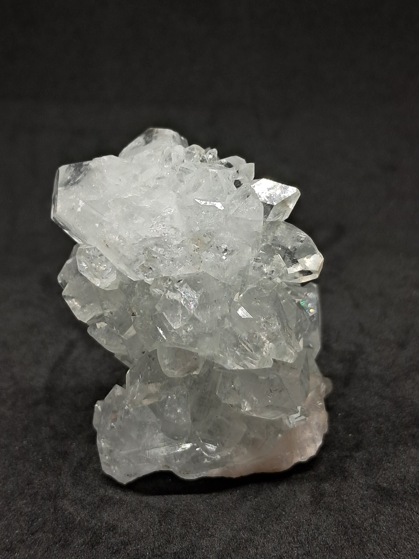 In this specimen Apophyllite crystals have grown on a Stalactite formation, alongside a couple of Stilbite crystals. Its crystals have a great lustre and a few points have rainbows inside.