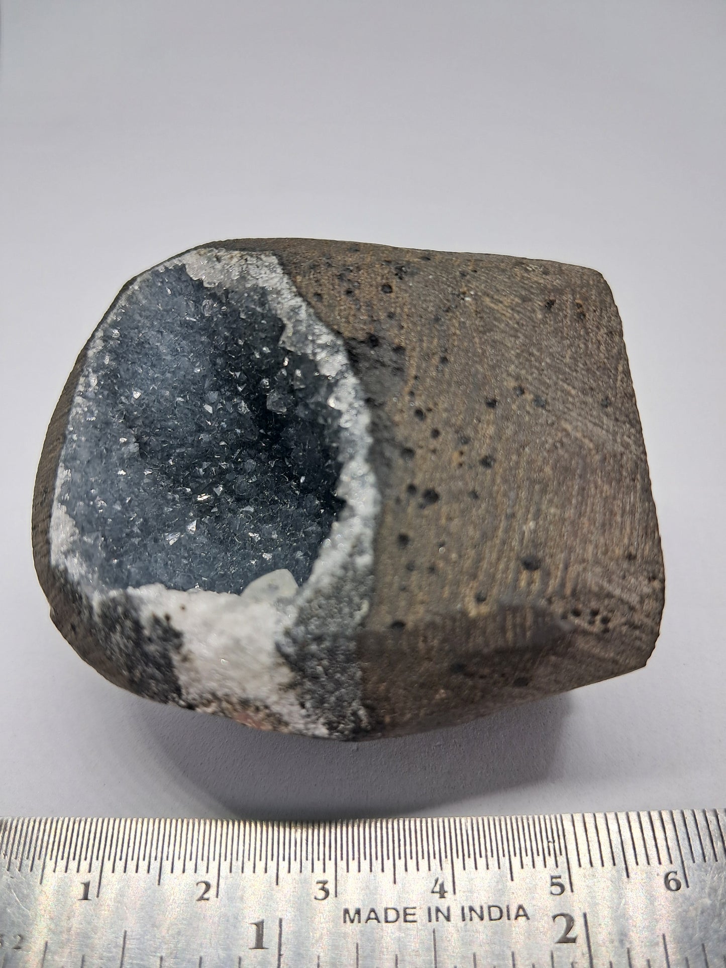 This Black Chalcedony has a blueish-greyish tone under light. We can see a Calcite crystal on the left side next to a small Quartz flower. The Basalt Geode has been shaped, so it can self-stand.