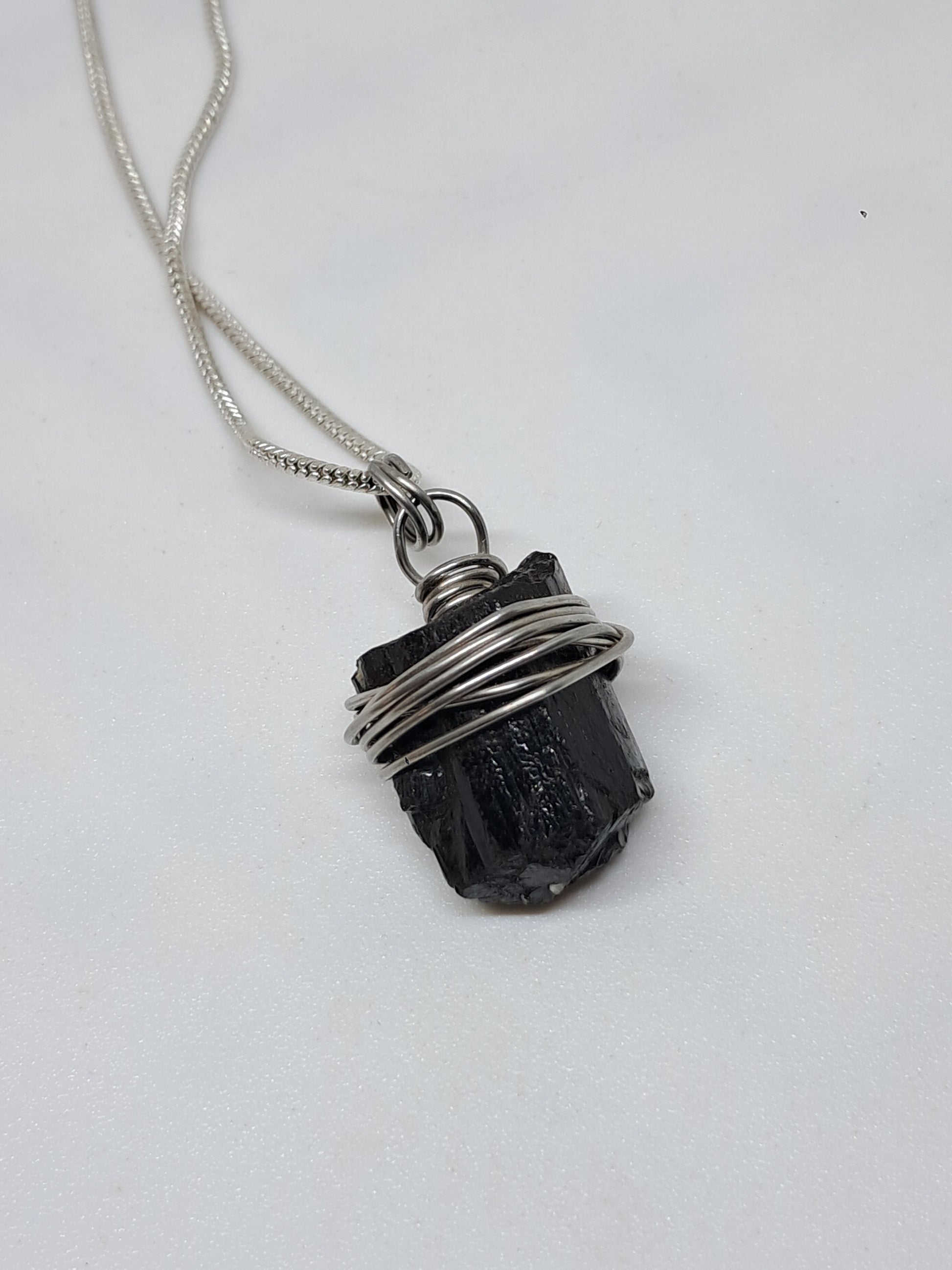 Beautiful natural black Tourmaline in its rough form wrapped in stainless steel wire. The Tourmaline is sourced from Karnataka. The design is simple and unisex. It includes a white metal chain.
