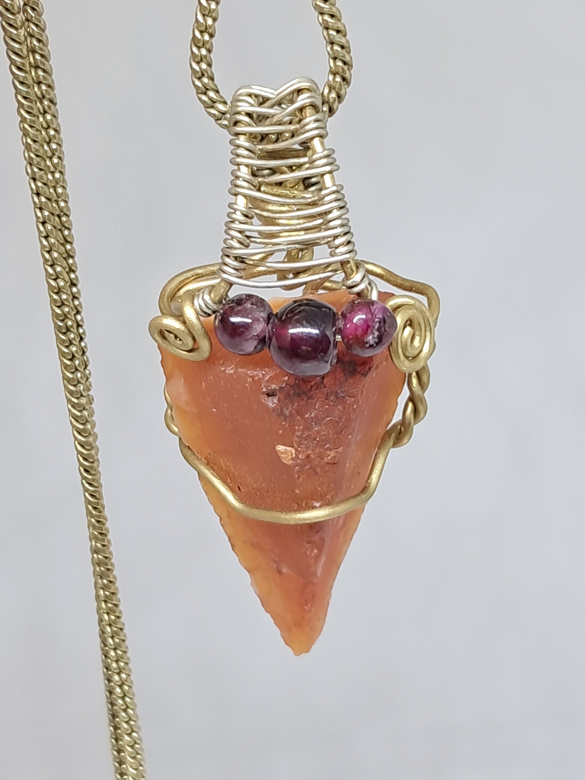 Natural Carnelian in its rough form wrapped in brass and white metal wire, with red Garnet beads. The design is rustic and unisex. It includes a brass chain.