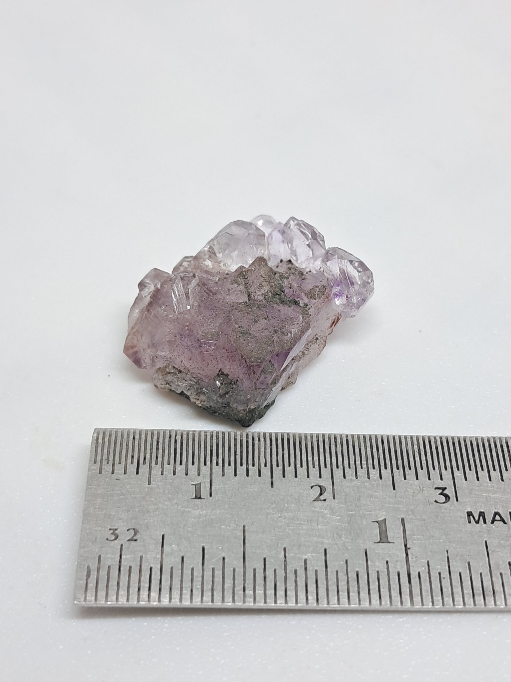 This small but well-formed cluster of Amethyst scepters show beautiful Herkimer like formation at the tips as well as inclusions of Hematite, Goethite and Magnetite.