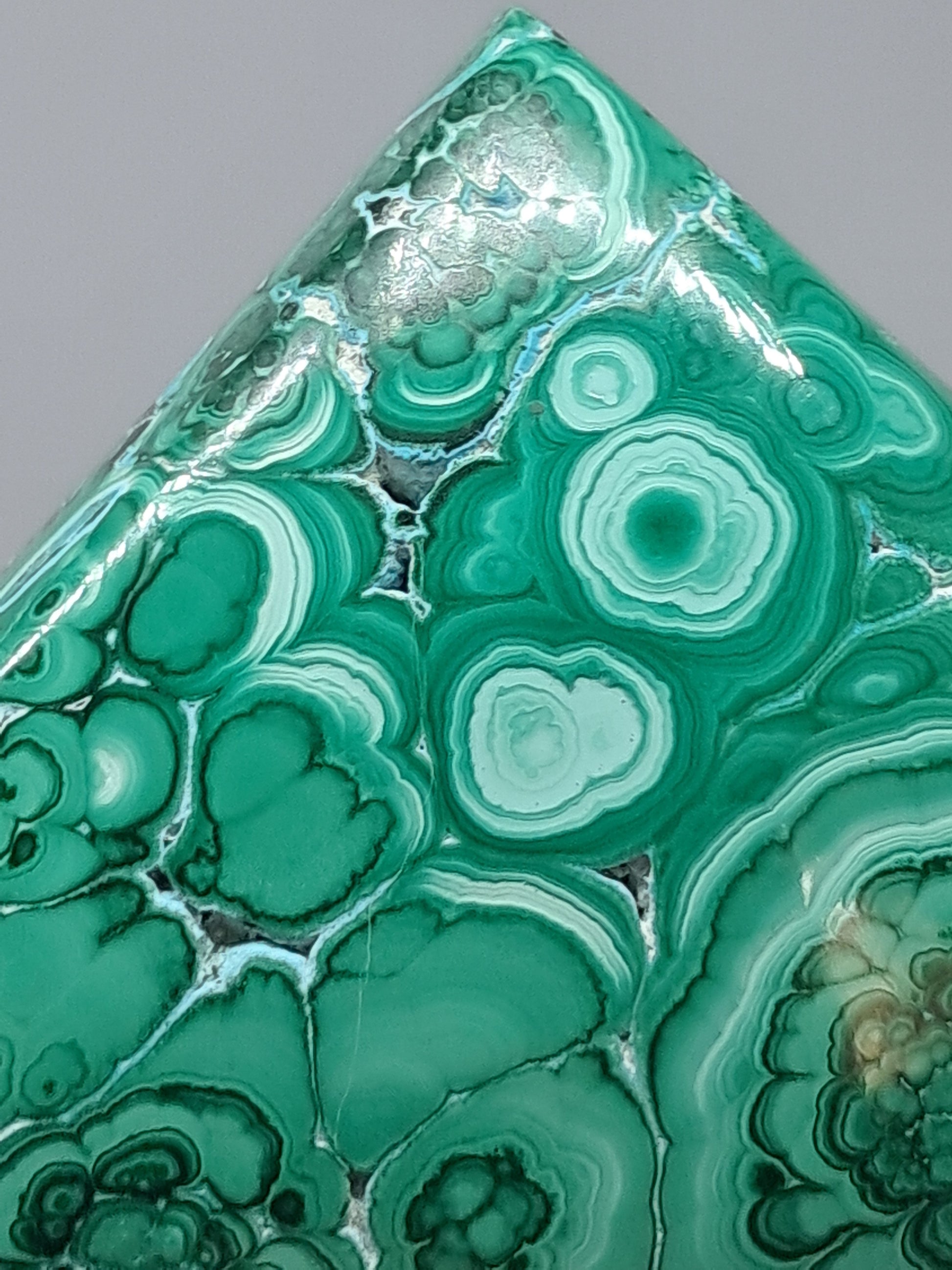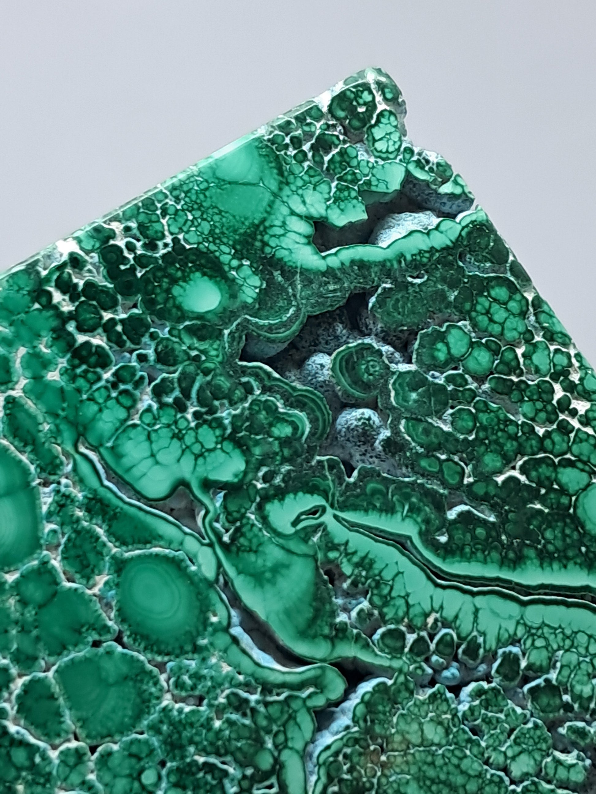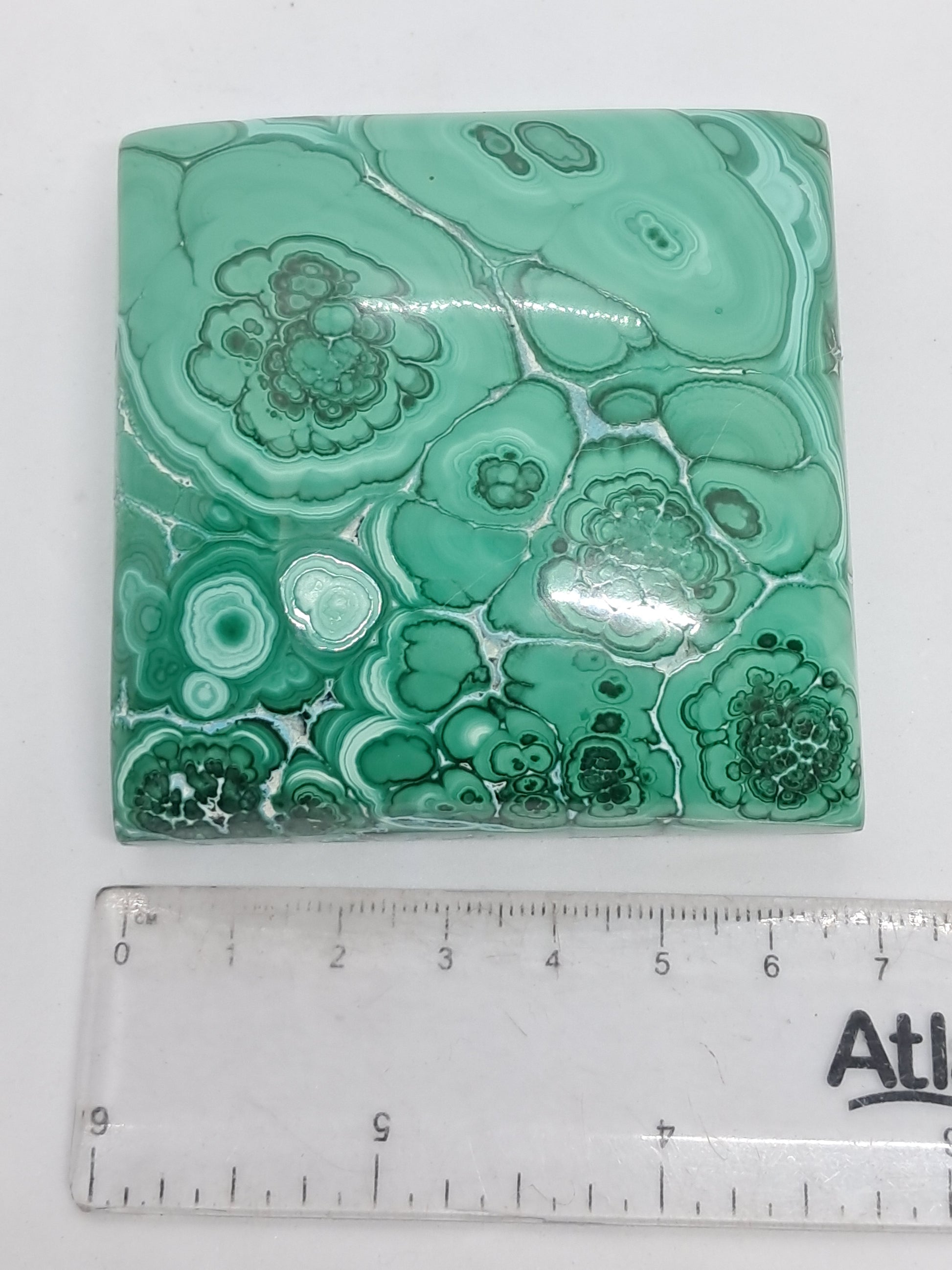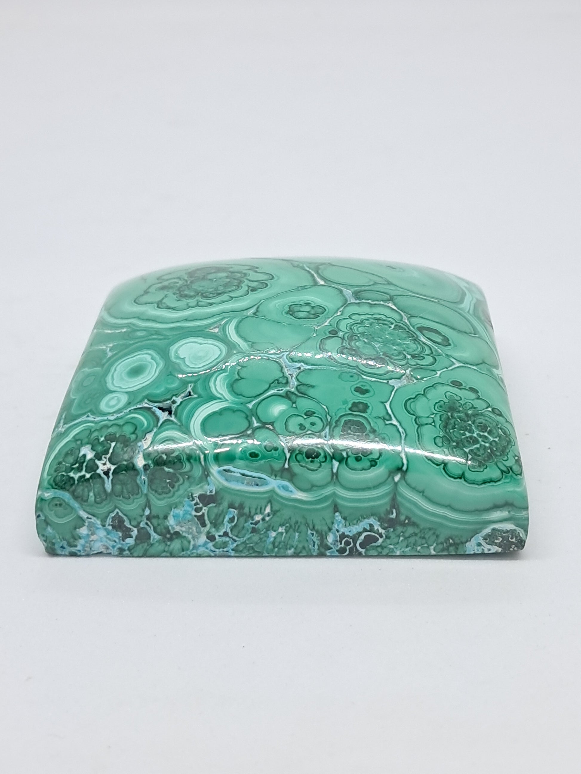This incredible specimen of Malachite and Chrysocolla has been polished in a square, soap shape. The polishing has brought out the incredible Malachite patterns. On the other side, natural gaps have been kept in tact so one can see botryoidal formation of Chrysocolla.