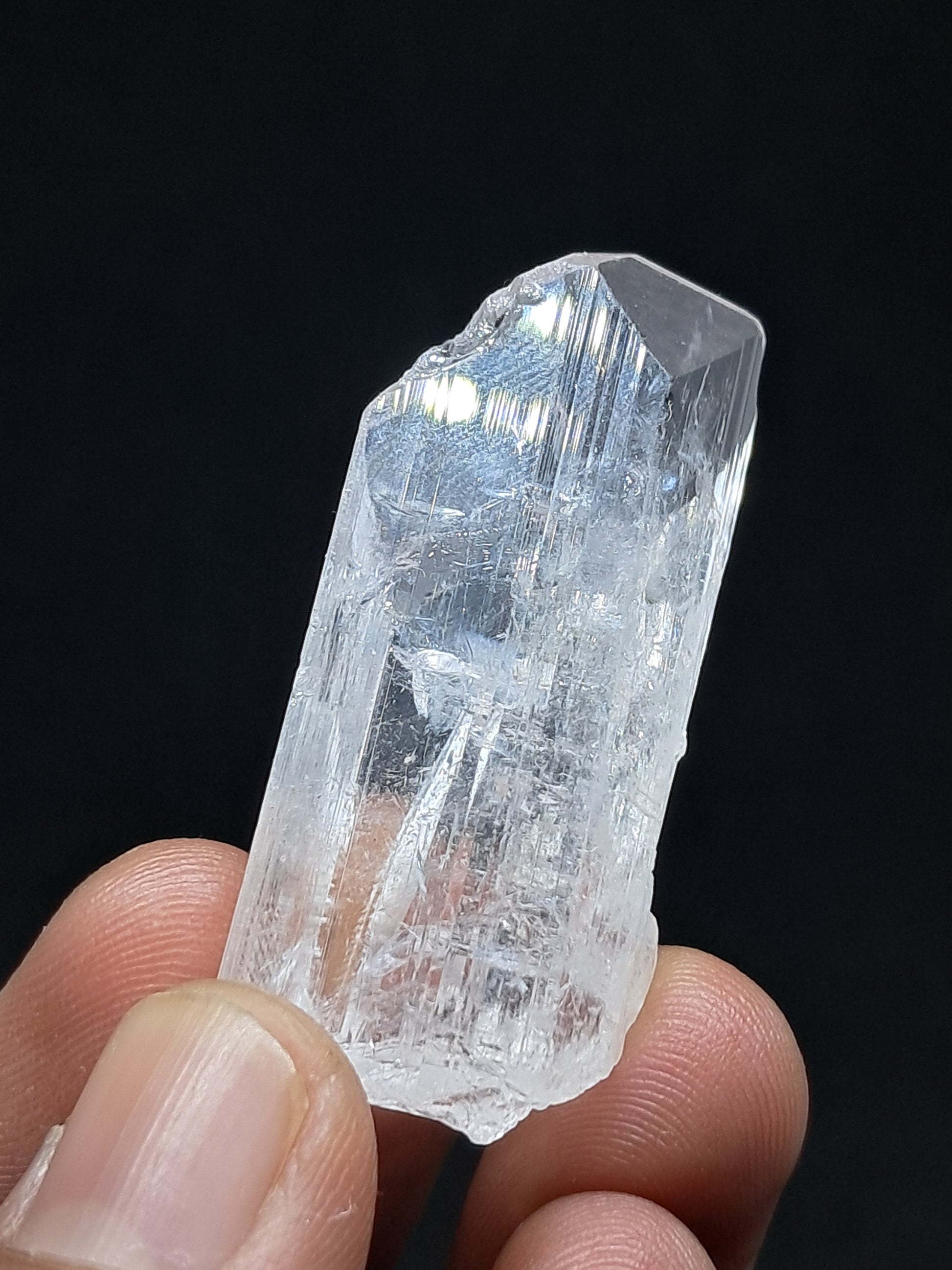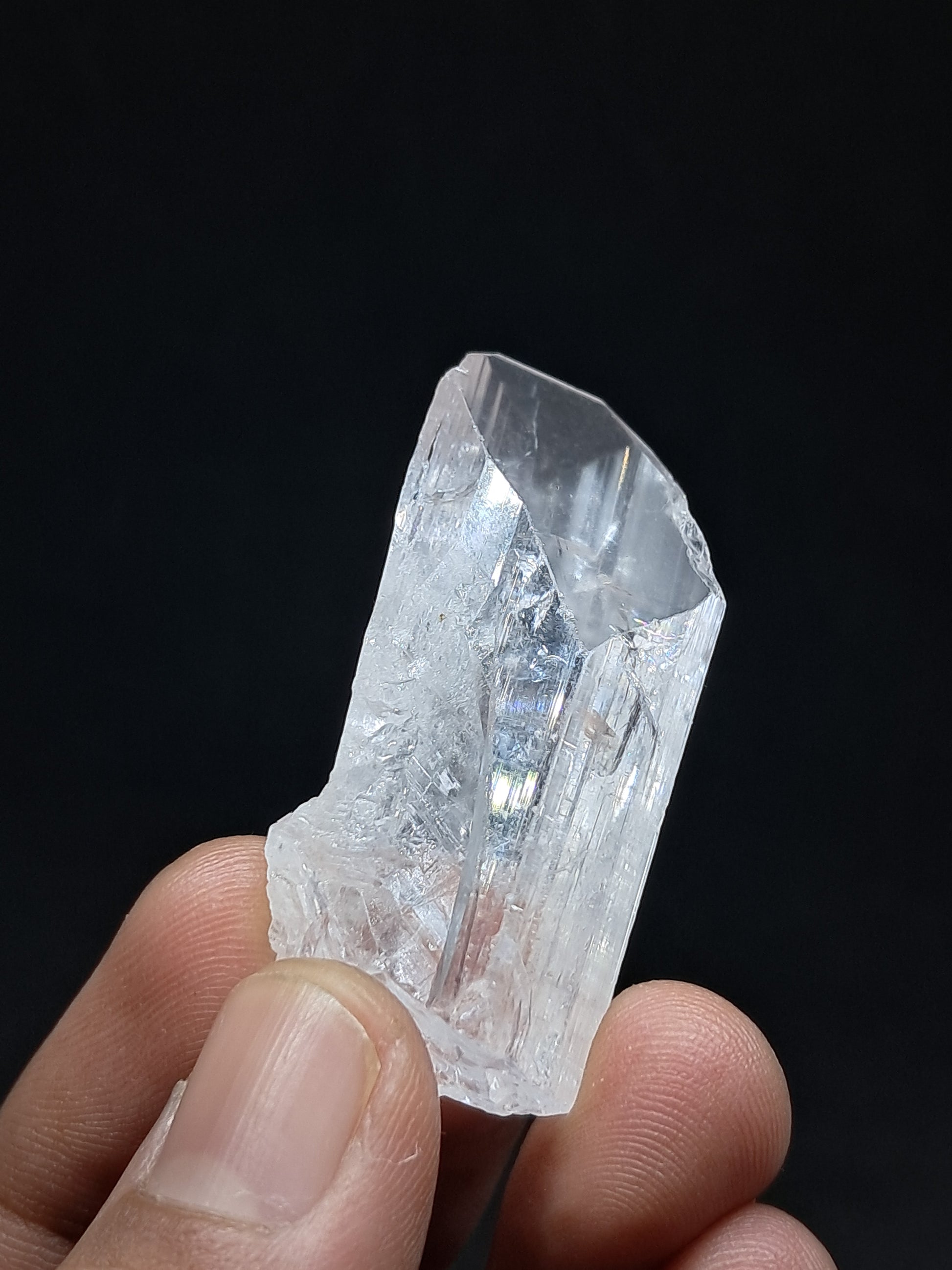 Beautiful large crystal of transparent Danburite showing beautiful termination and growth lines. It also shows multiple rainbows. At certain angles the crystal shows subtle pinkish hue.