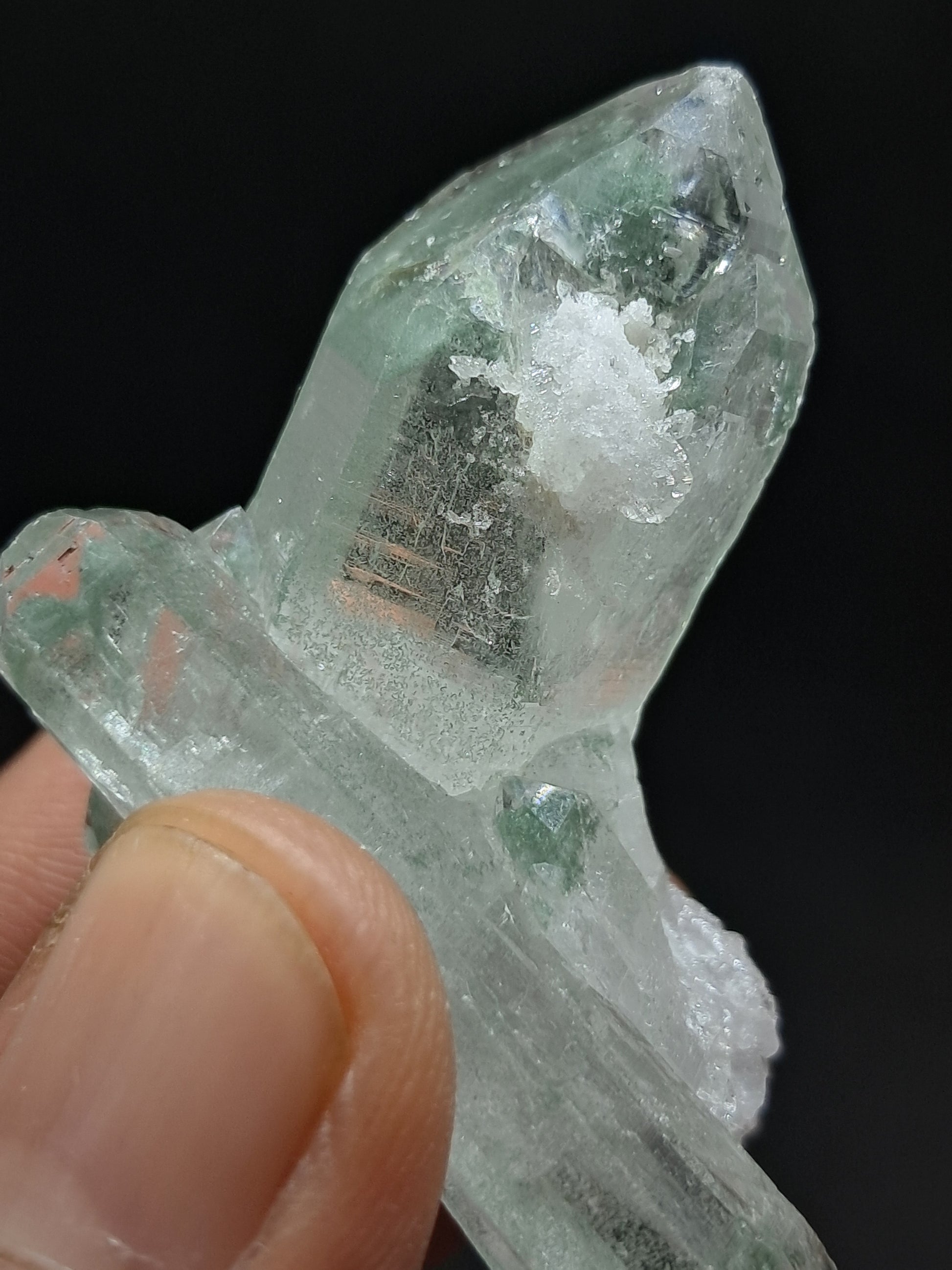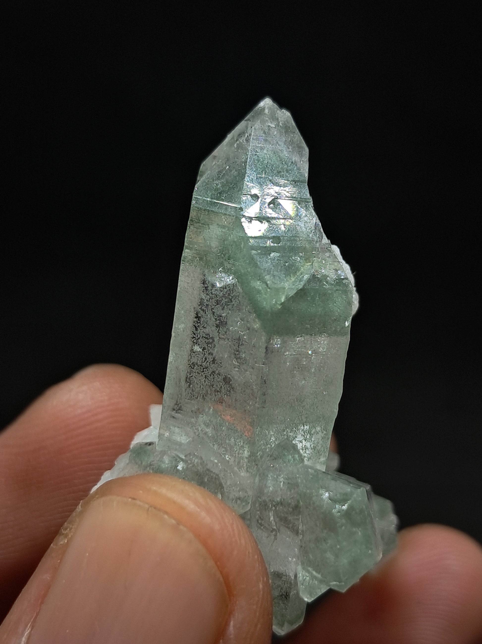 Beautiful cluster of multiple biterminated Quartz crystals. The big crystal shows self-healed tip with multiple terminations. All the crystals also show phantoms formed by Green Chlorite inclusions.