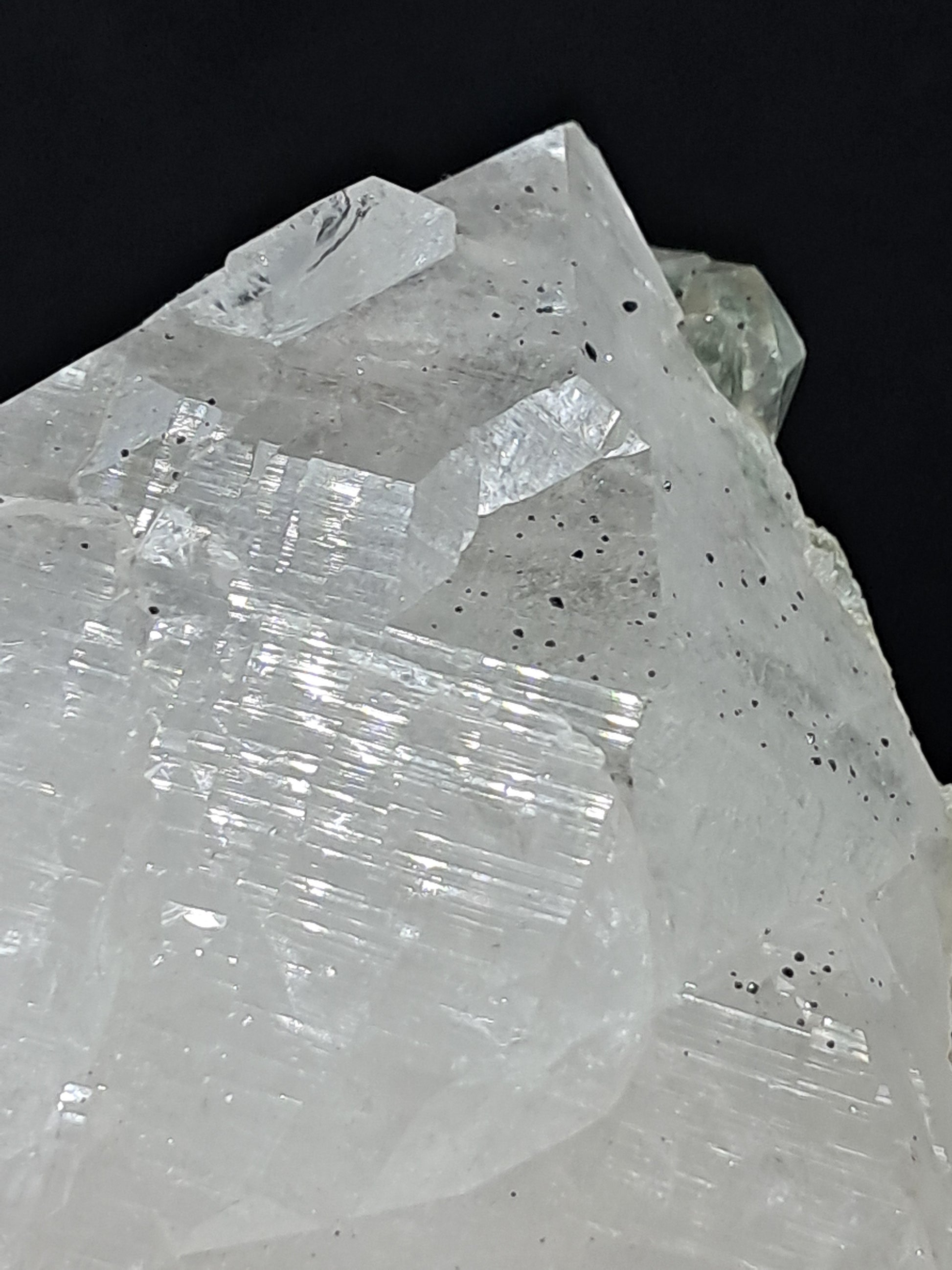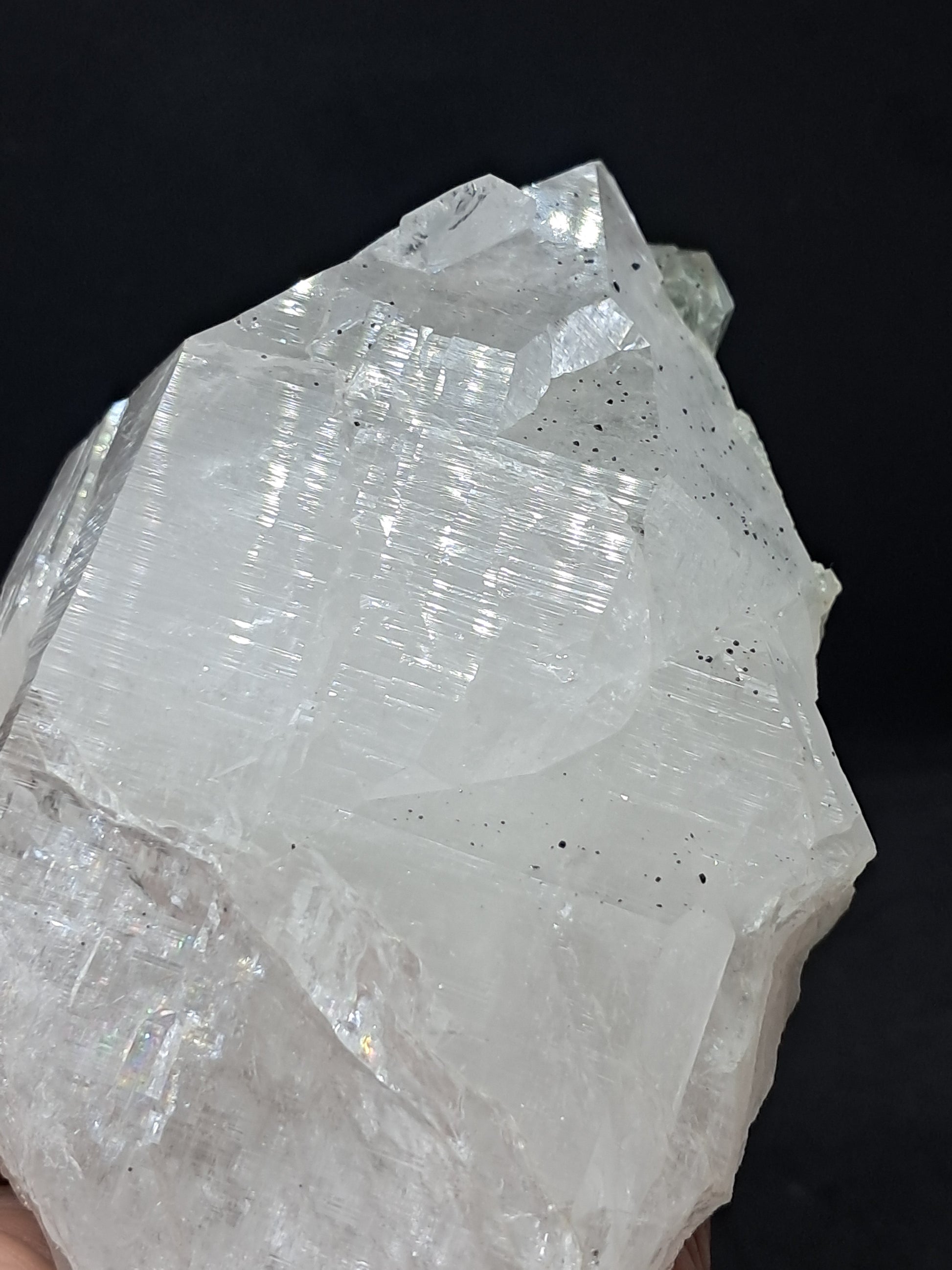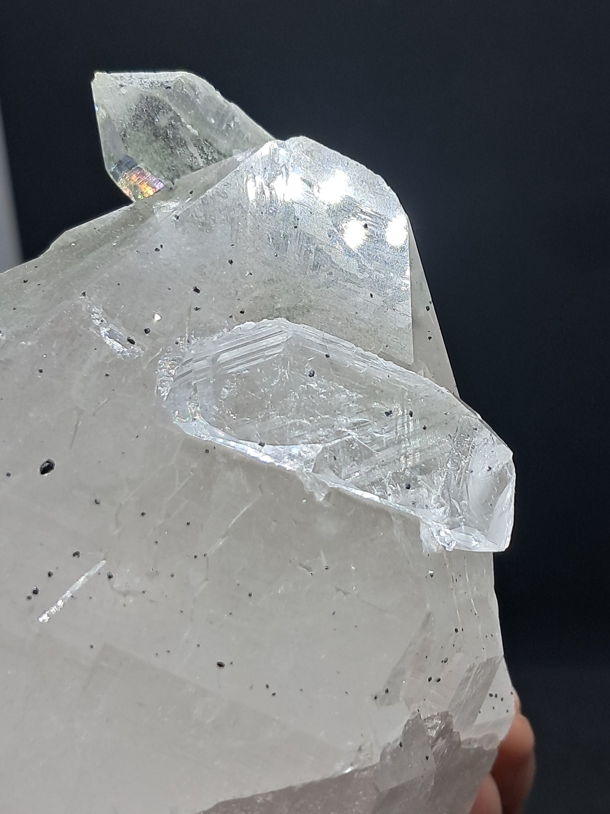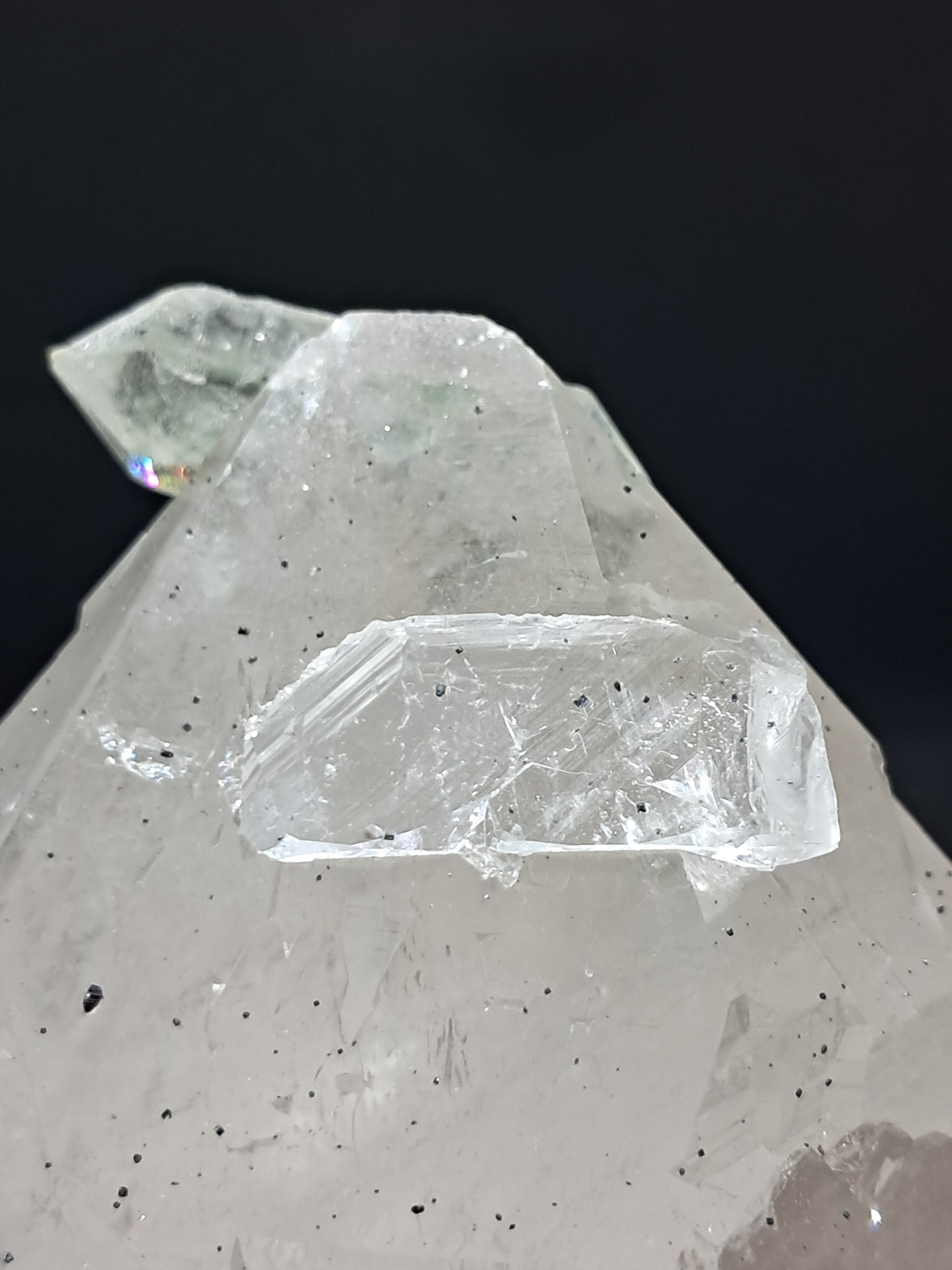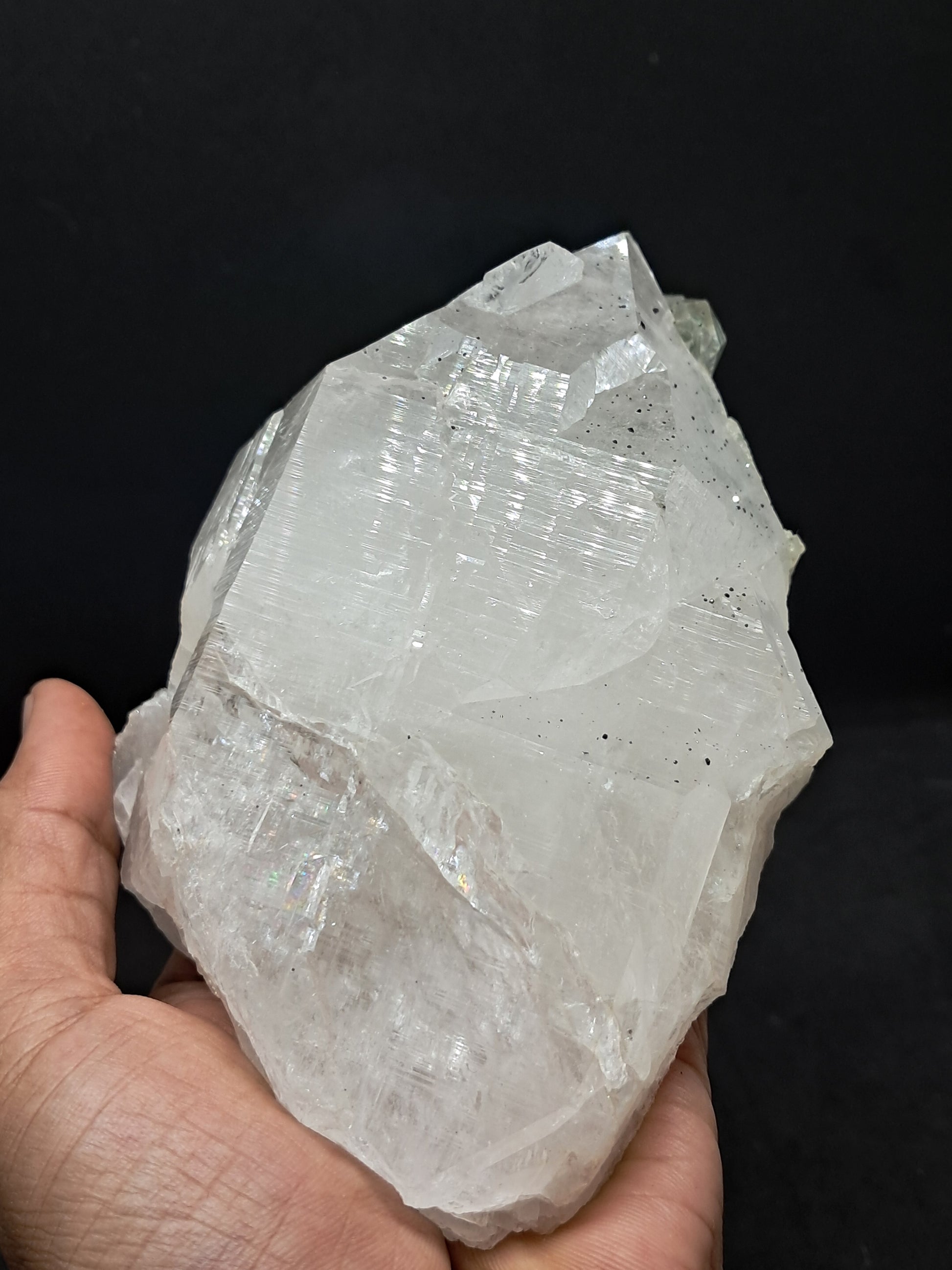 This is an almost a kilo of high grade Himalayan Quartz point. The point shows stepped termination, magnetite inclusions and mulitple rainbows. On the front side, a flat point of Quartz has formed, fused in the face. The backside shows well formed biterminated Quartz with Green Chlorite inclusion. A must have piece for Quartz collectors.