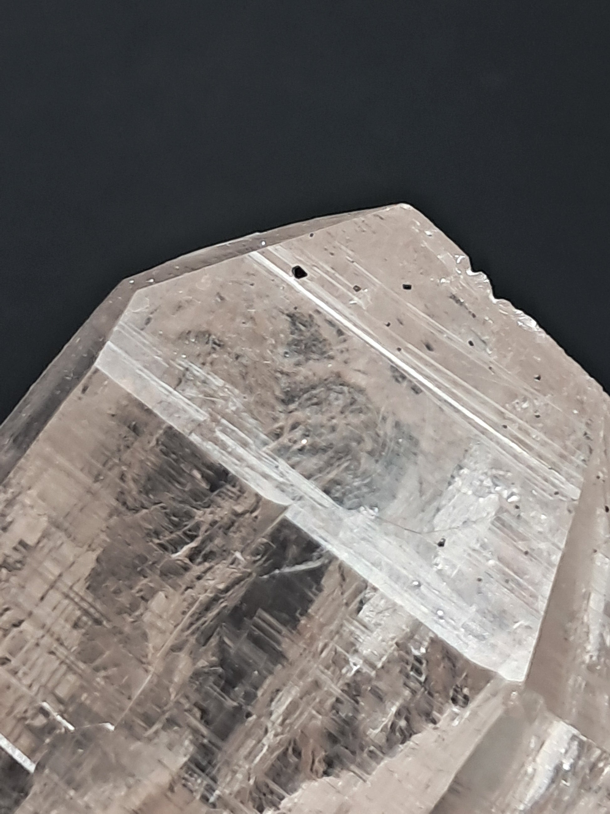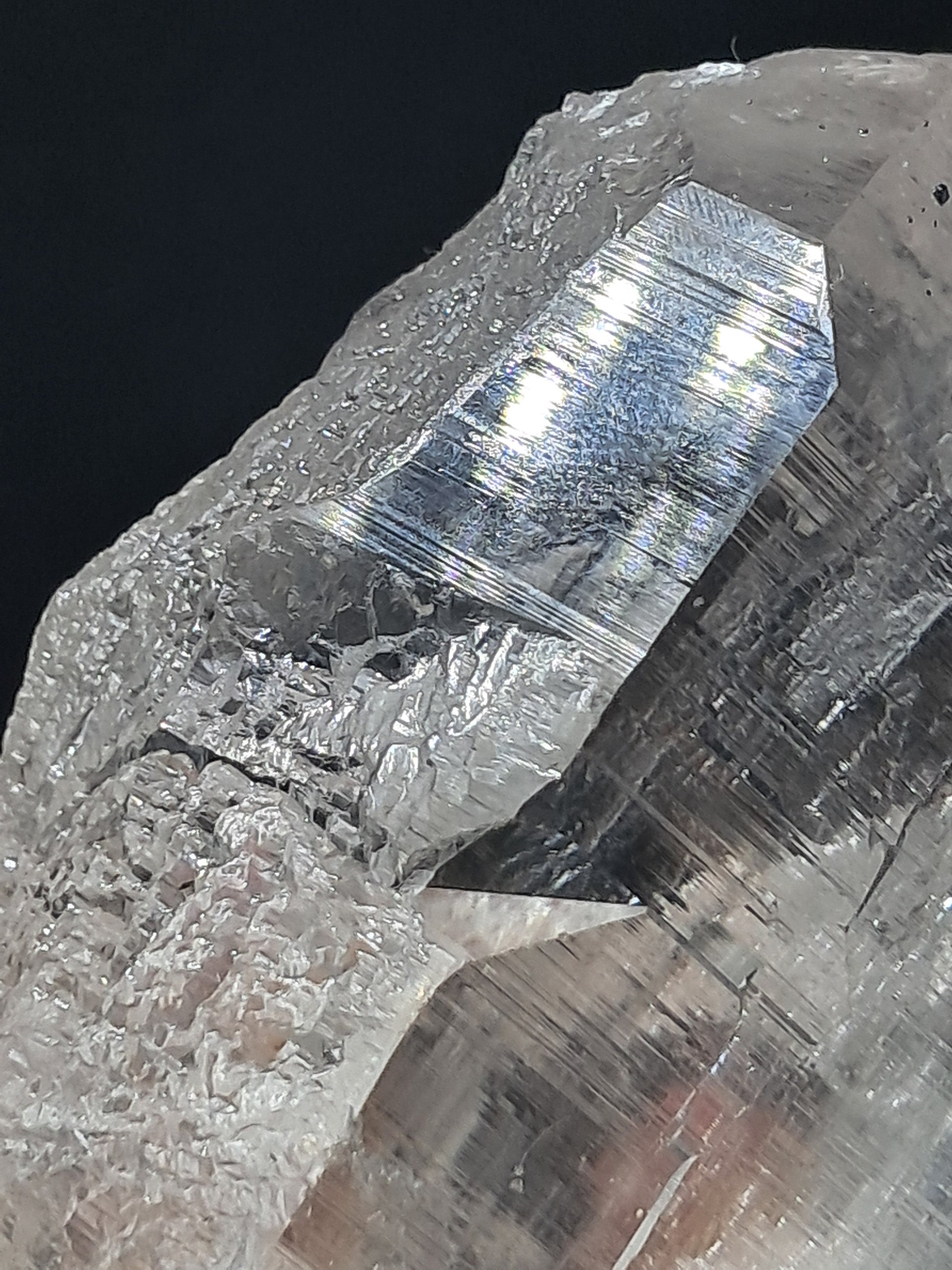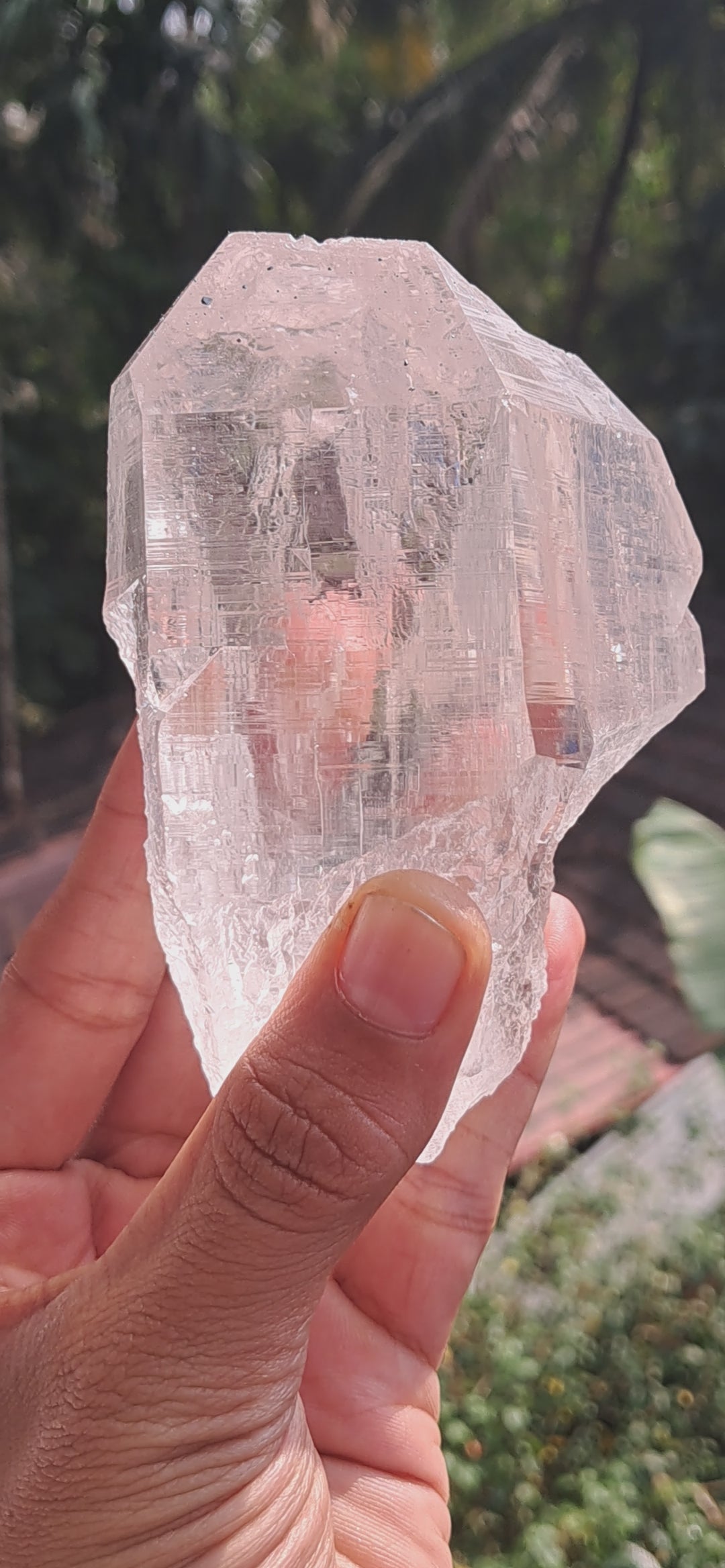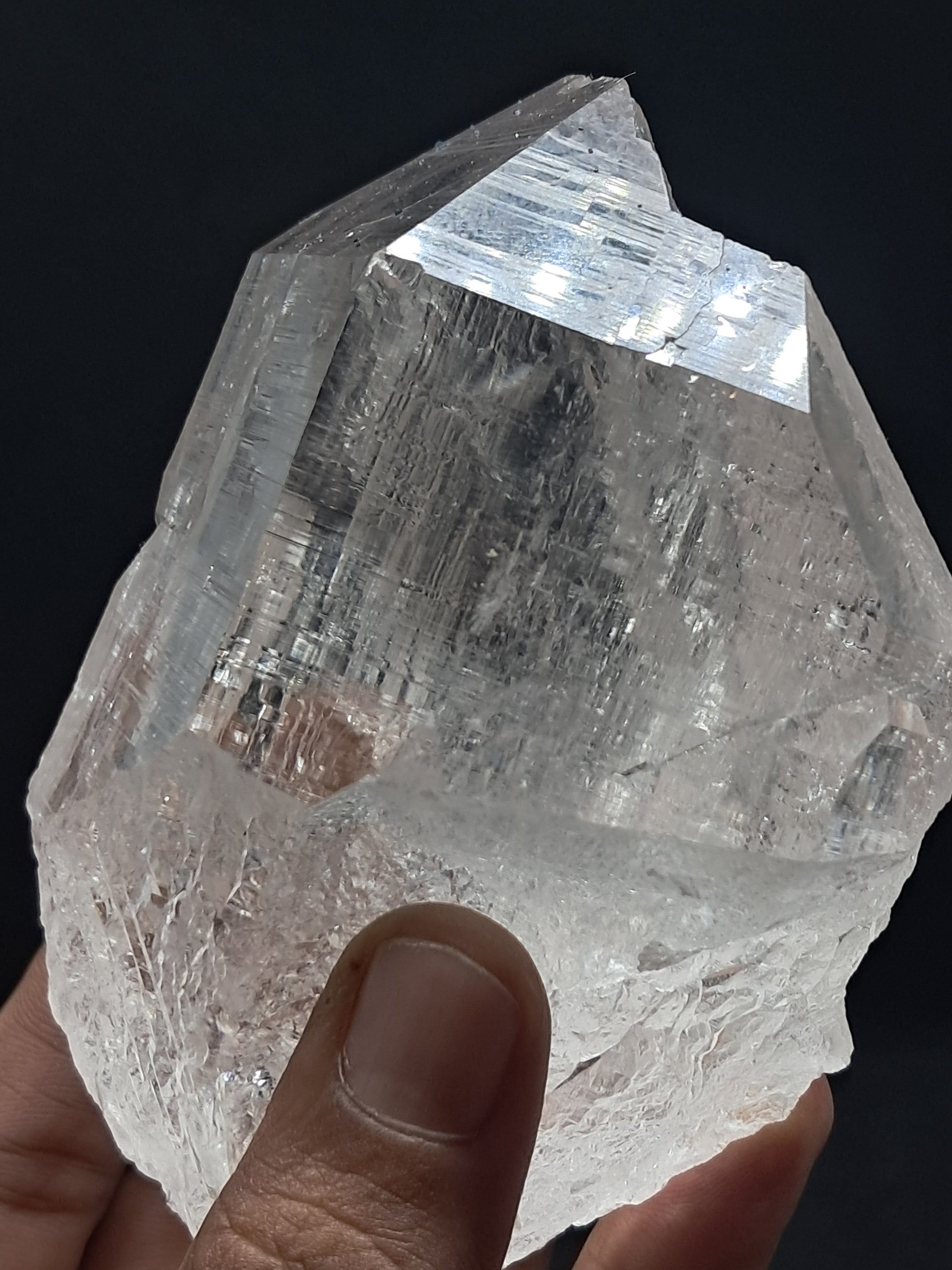 This is a high grade Clear Quartz from Himalayas with flat termination. It shows incredible clarity, prominent striation lines and Magnetite inclusions. Also entire one side of the crystal is self-healed.