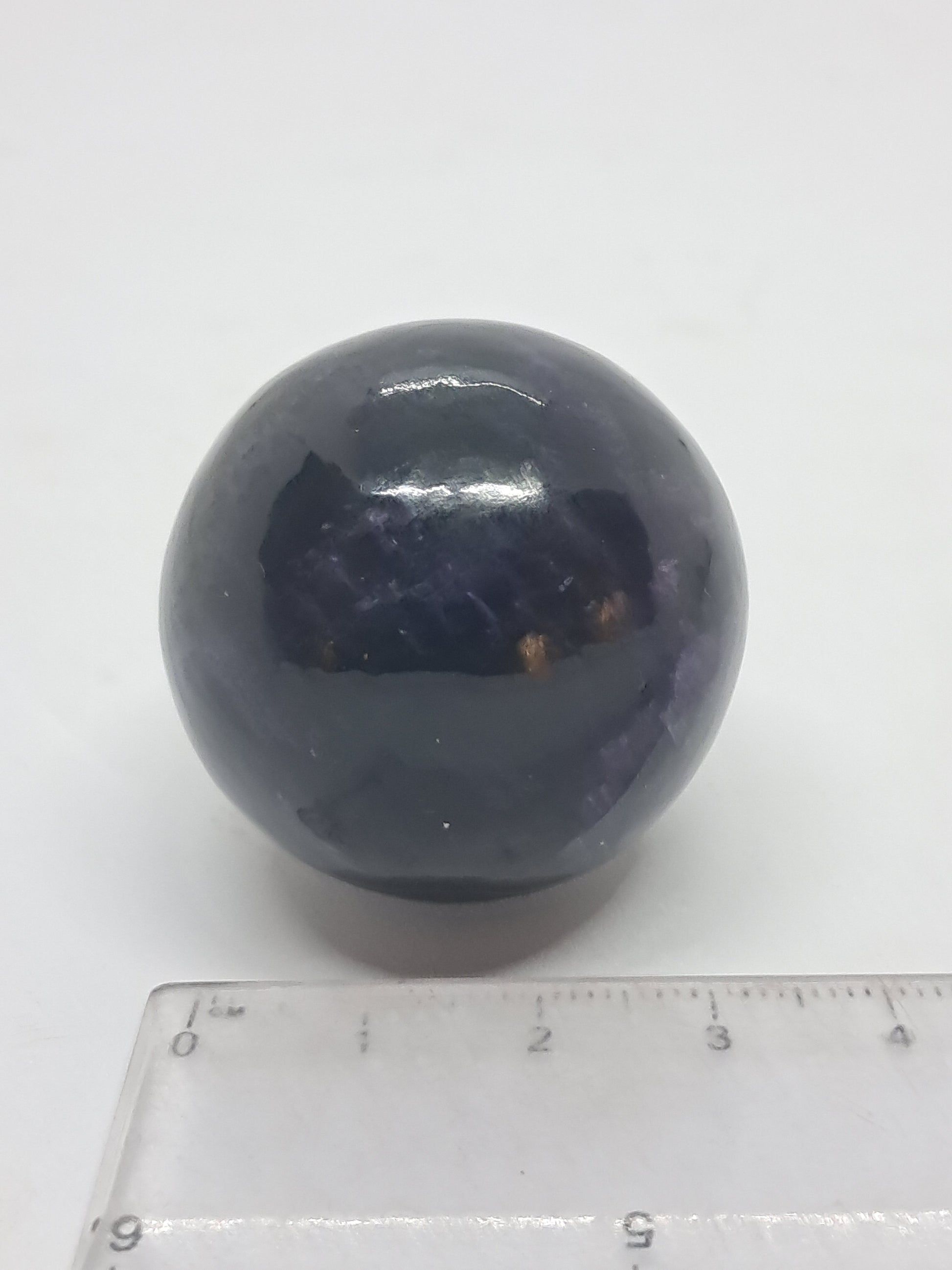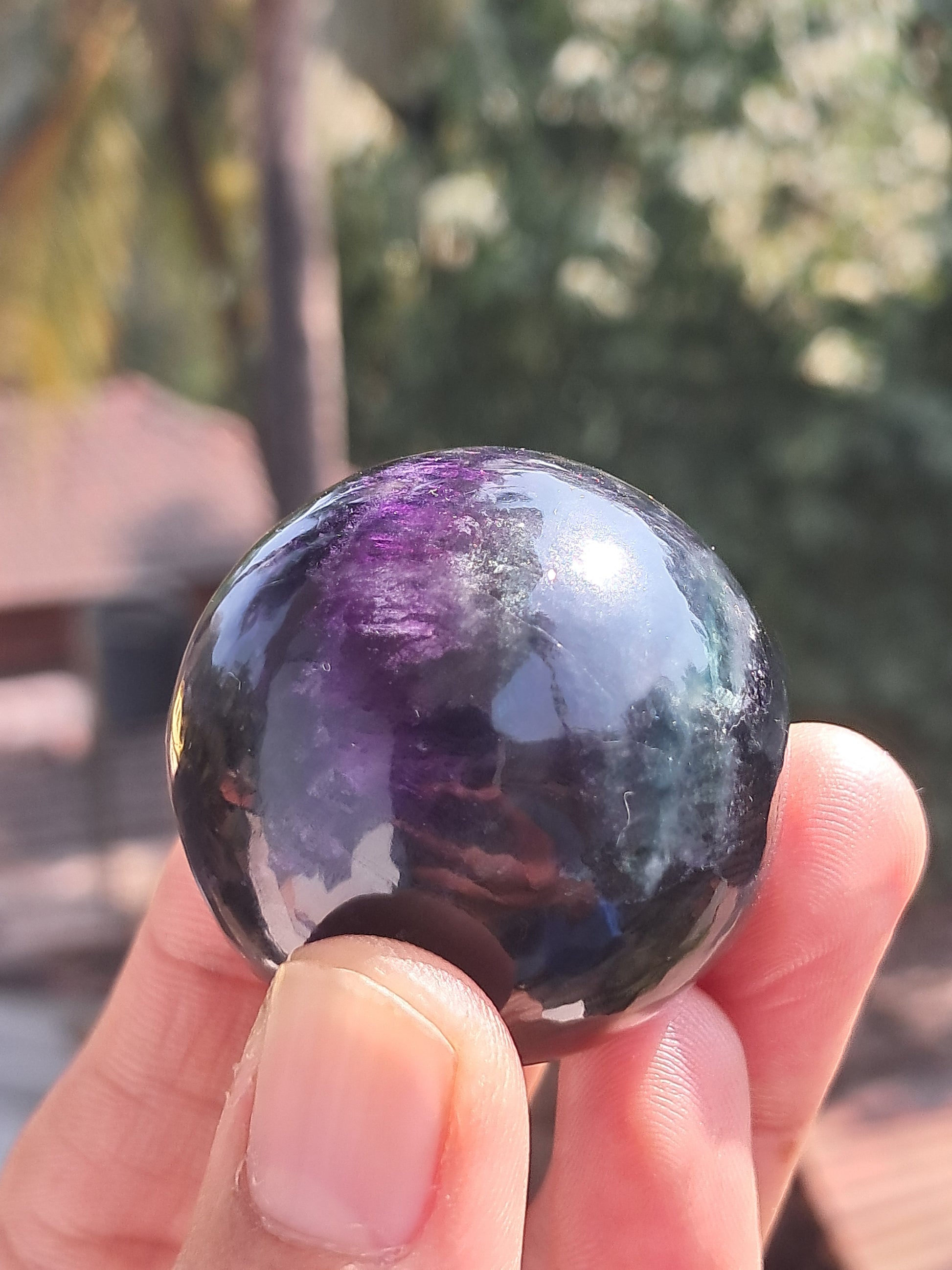 Beautifully polished sphere of Rainbow Fluorite with deep purple and green colours and rare chatoyance.