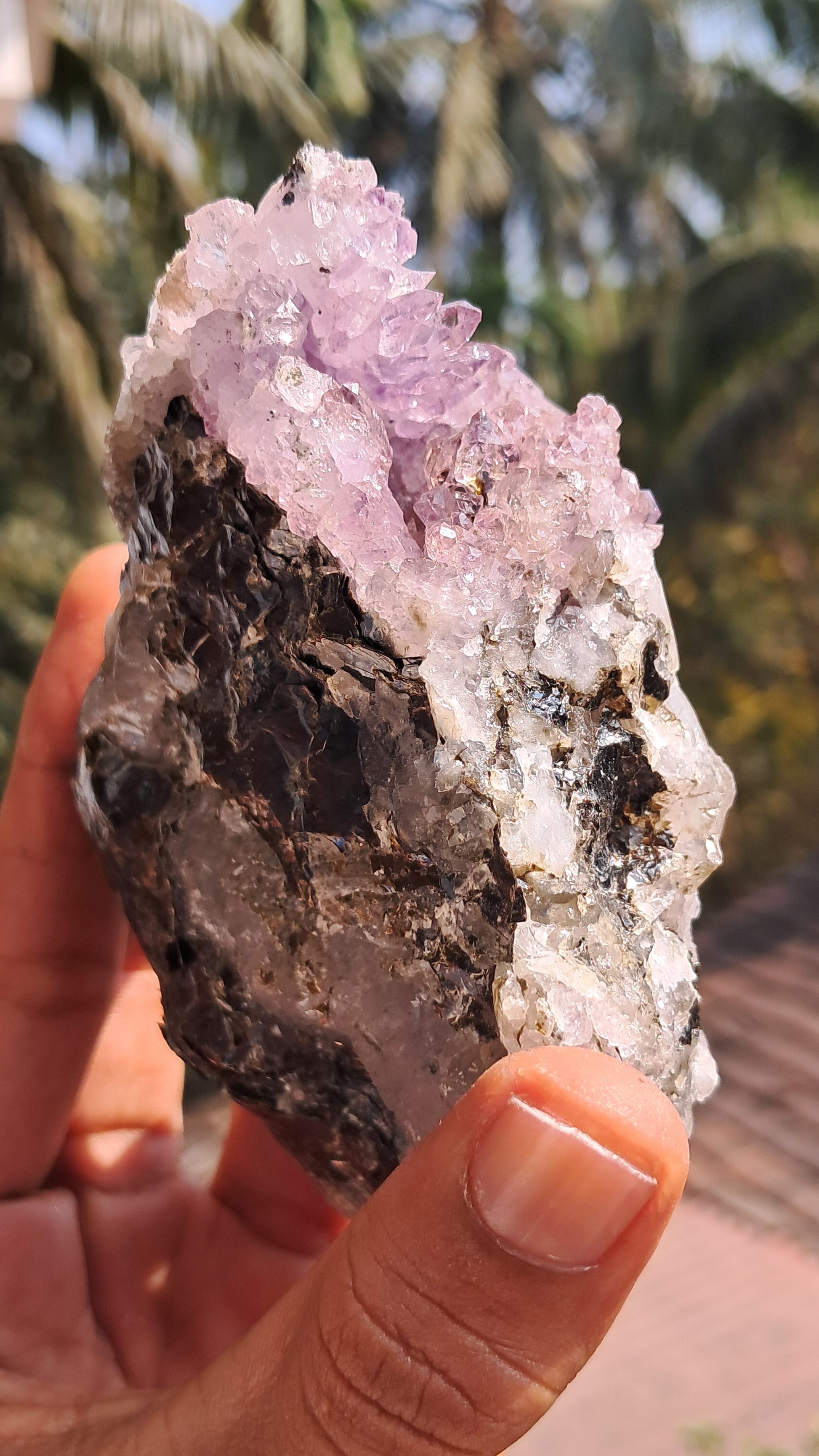 The specimen shows vibrant scepters of Amethyst formed inside a small cavity of a Quartz. The Quartz is coated by Mica and Amethyst scepters show interesting inclusions.