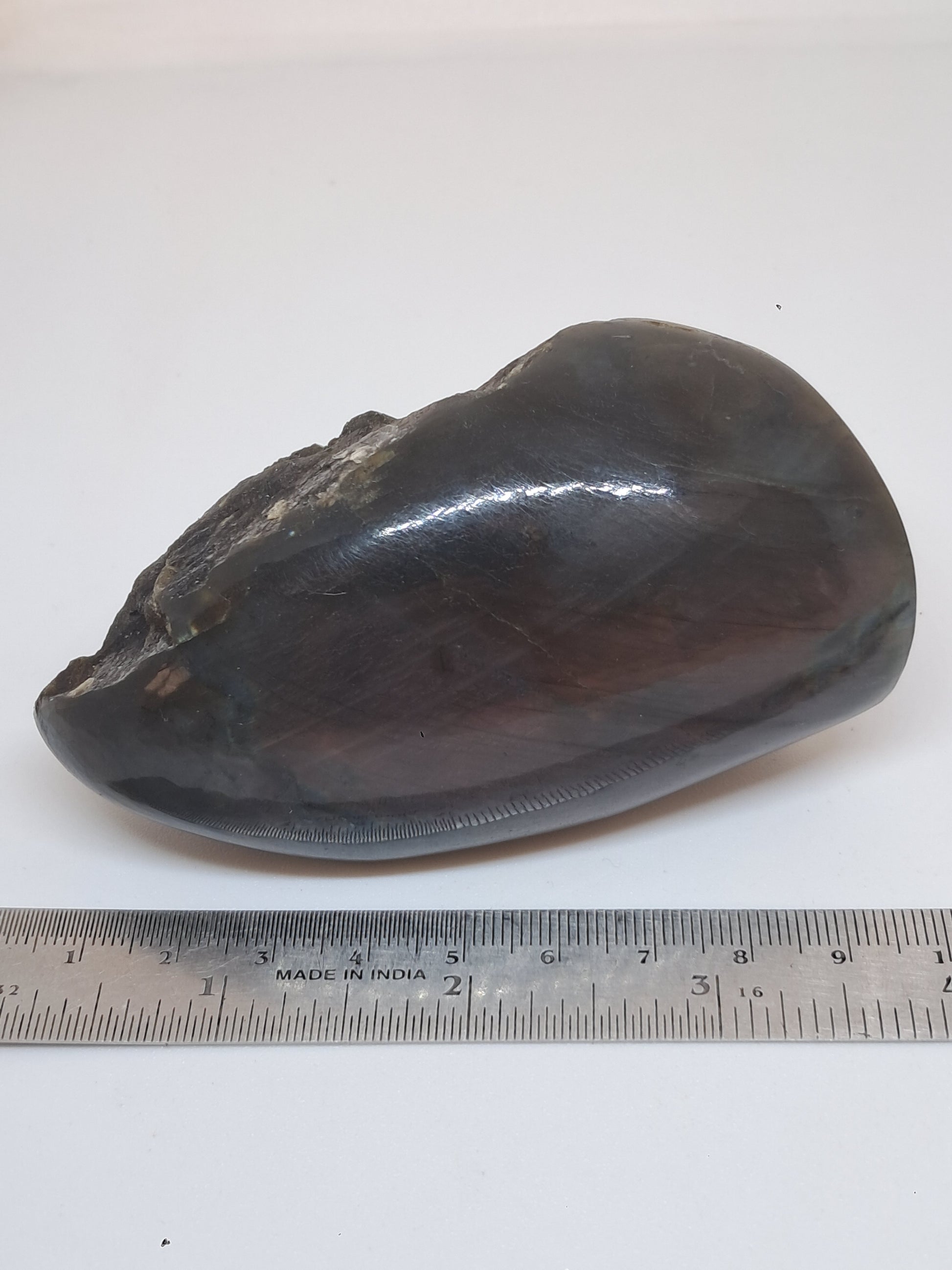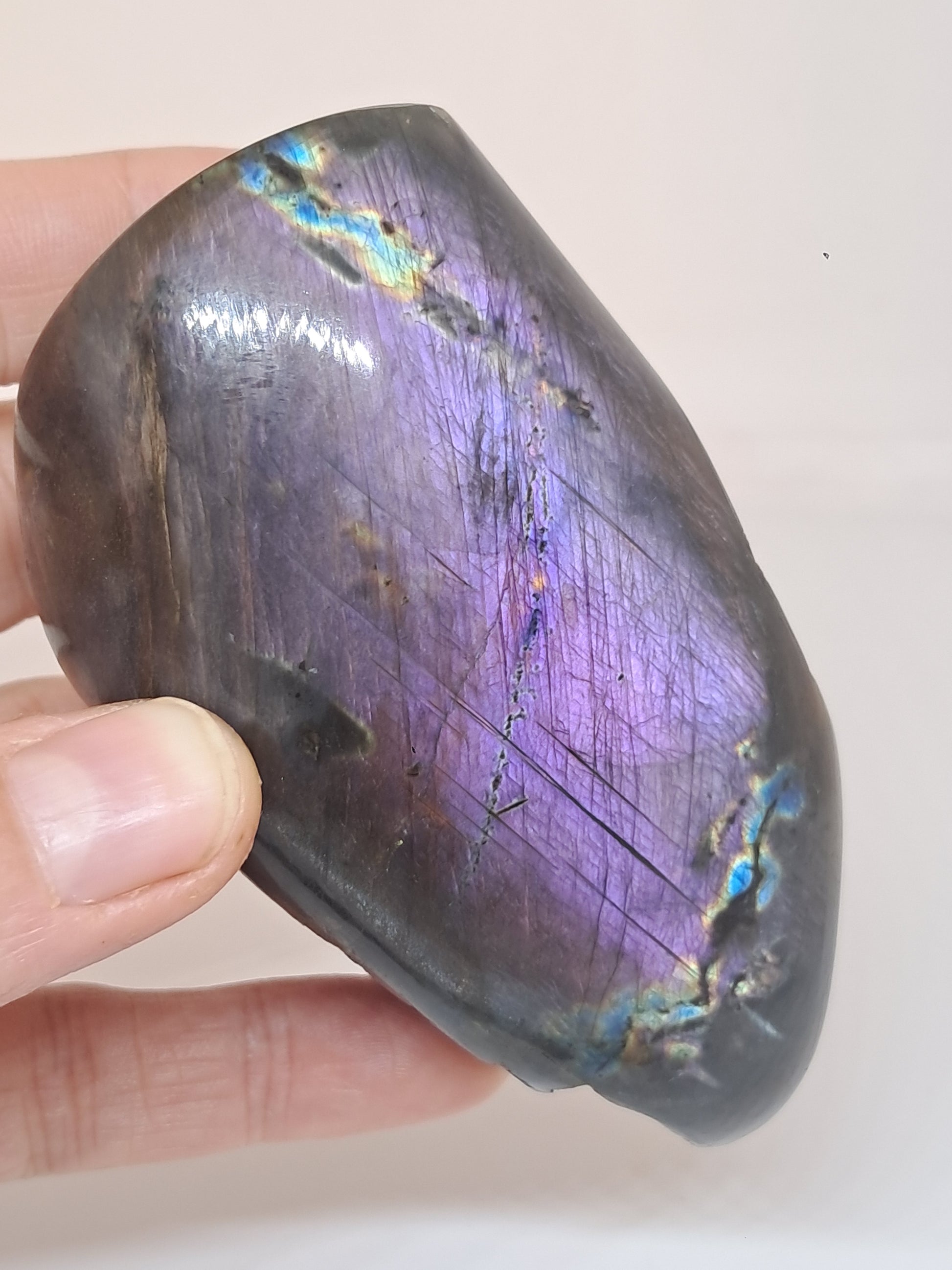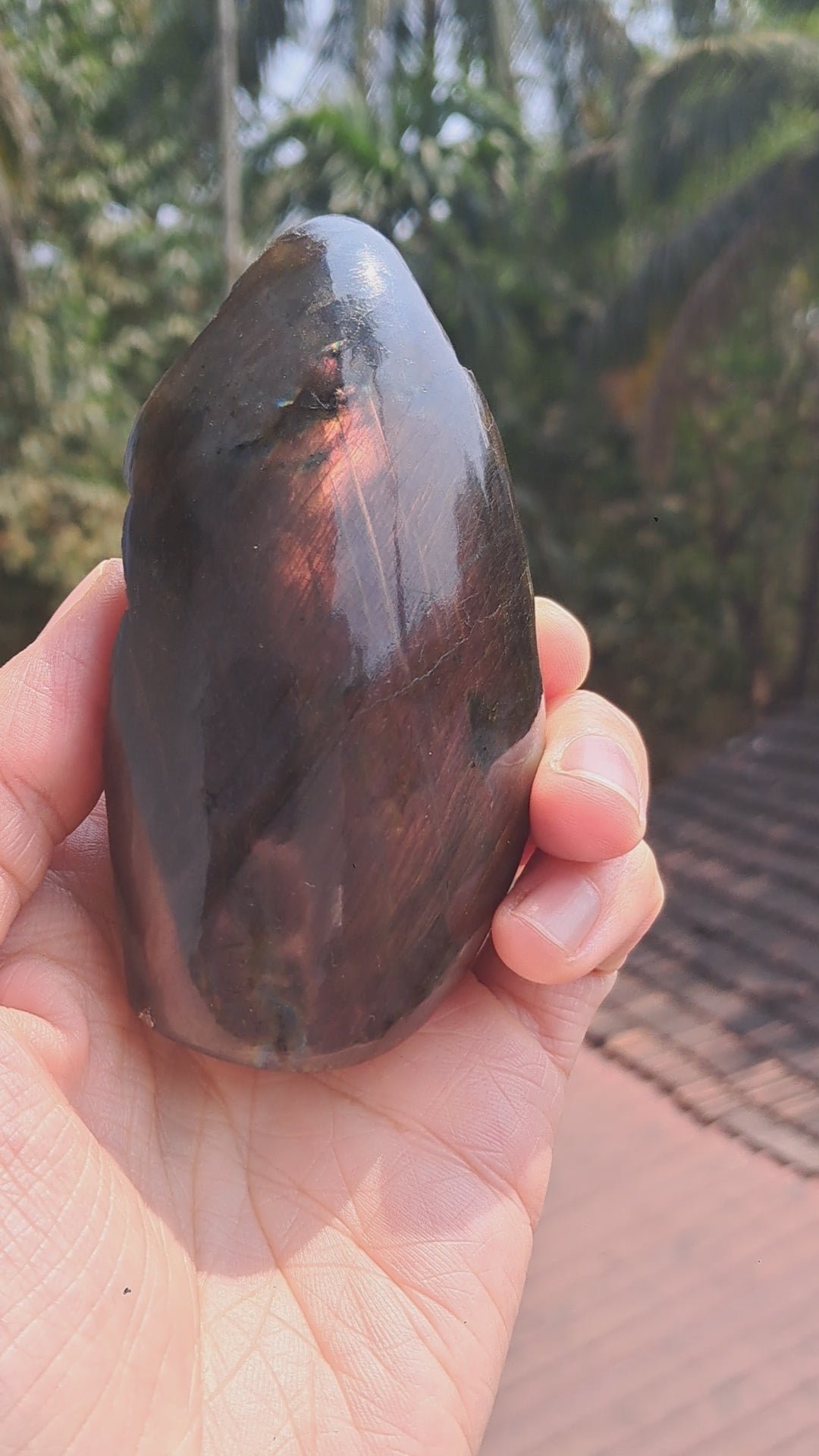 Natural Labradorite polished from one side and rough from the other. With a flat base to self-stand. Showing intense purple color, which changes to a deep red-pink under natural sunlight.