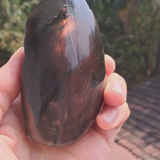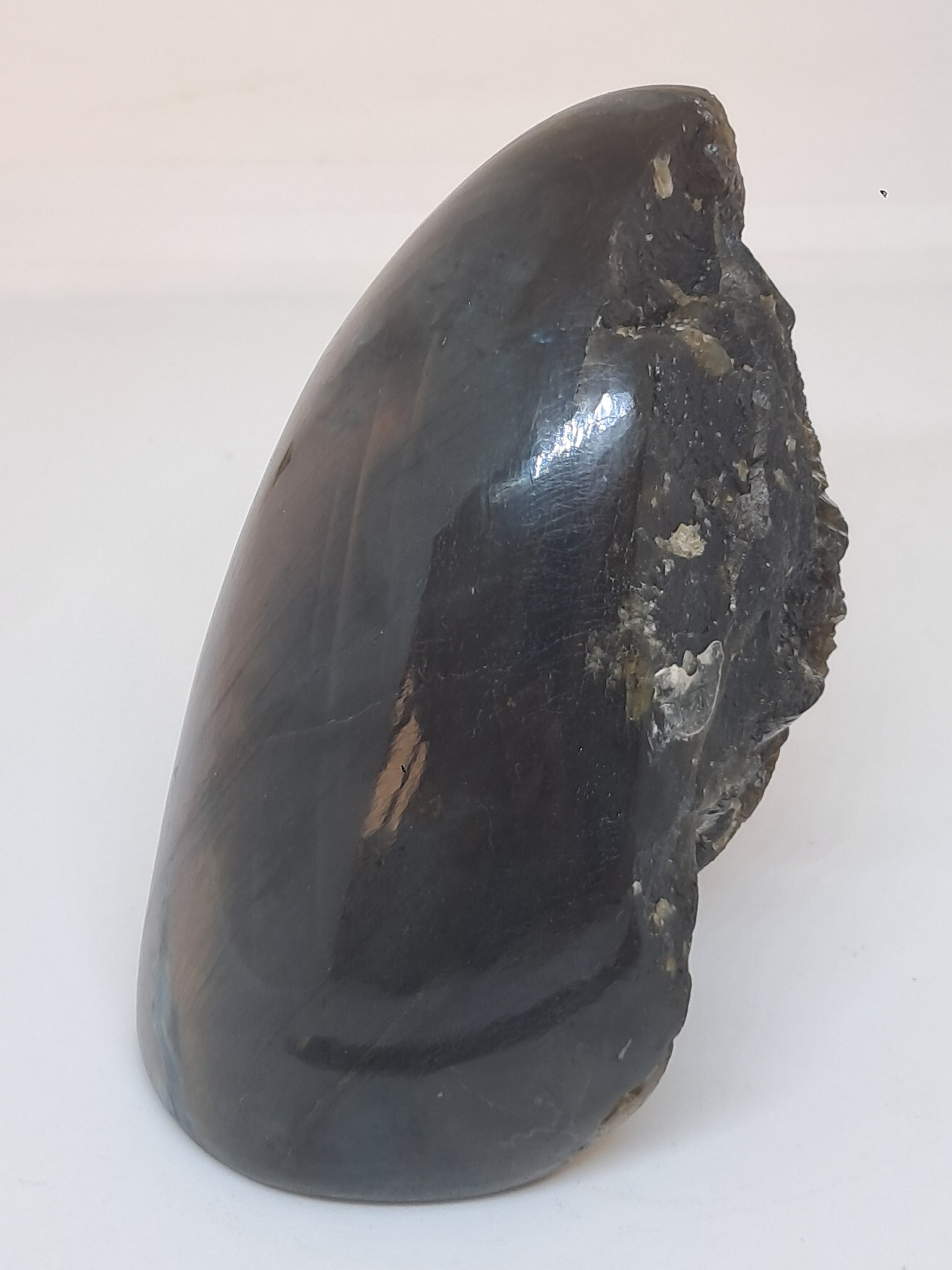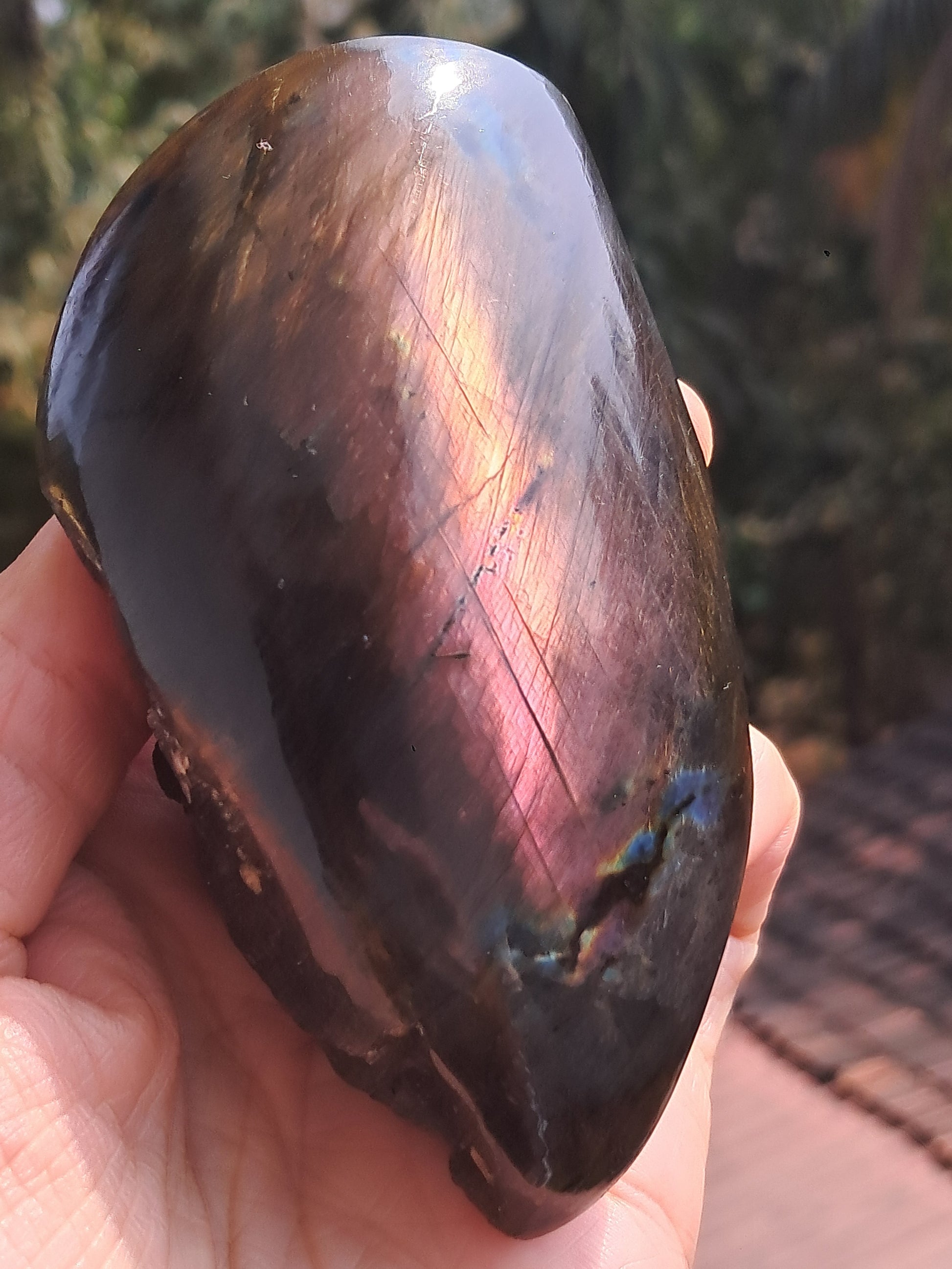 Natural Labradorite polished from one side and rough from the other. With a flat base to self-stand. Showing intense purple color, which changes to a deep red-pink under natural sunlight.