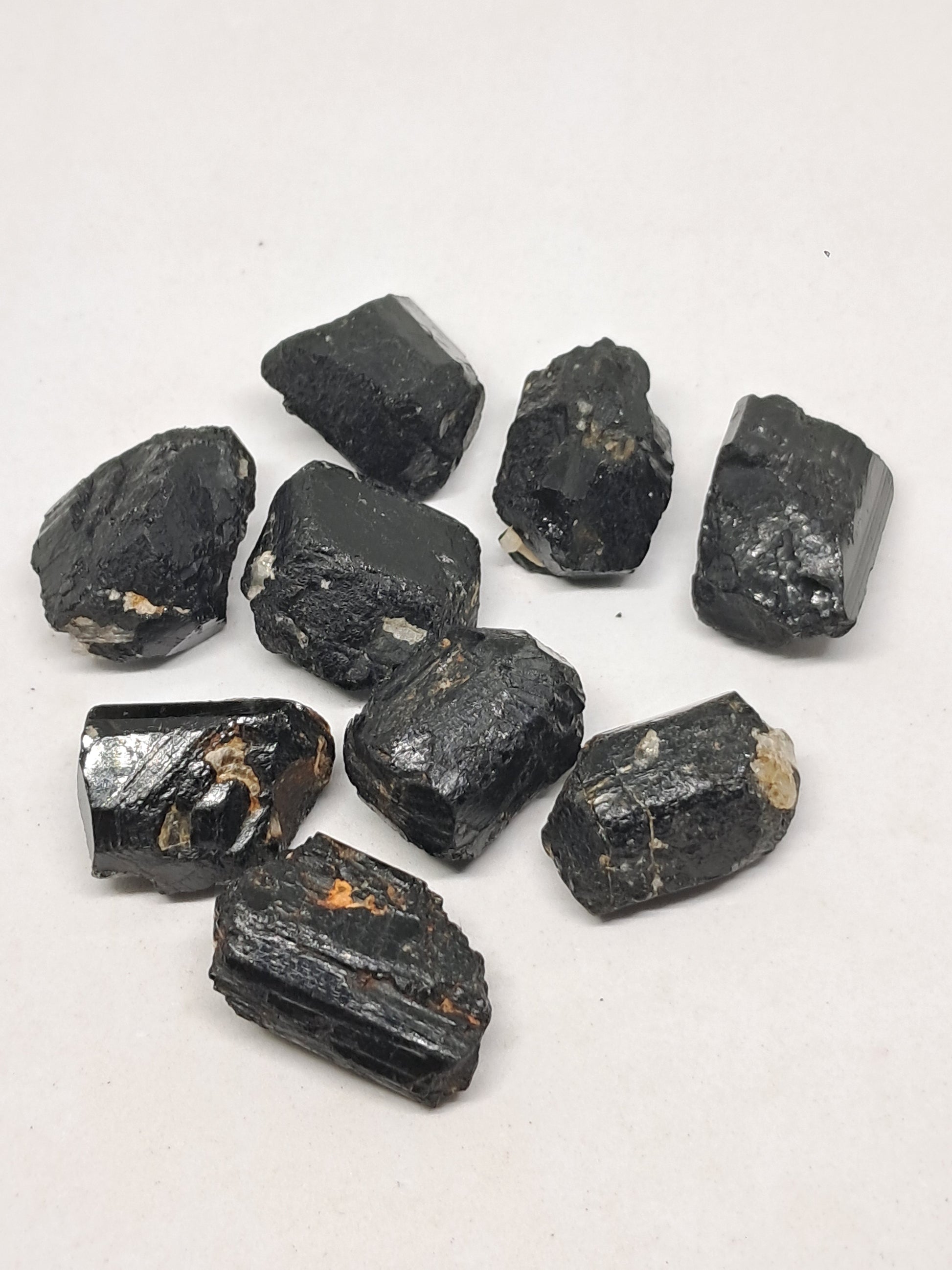 Rough crystals of Black Tourmaline. Some may have natural termination on one side.