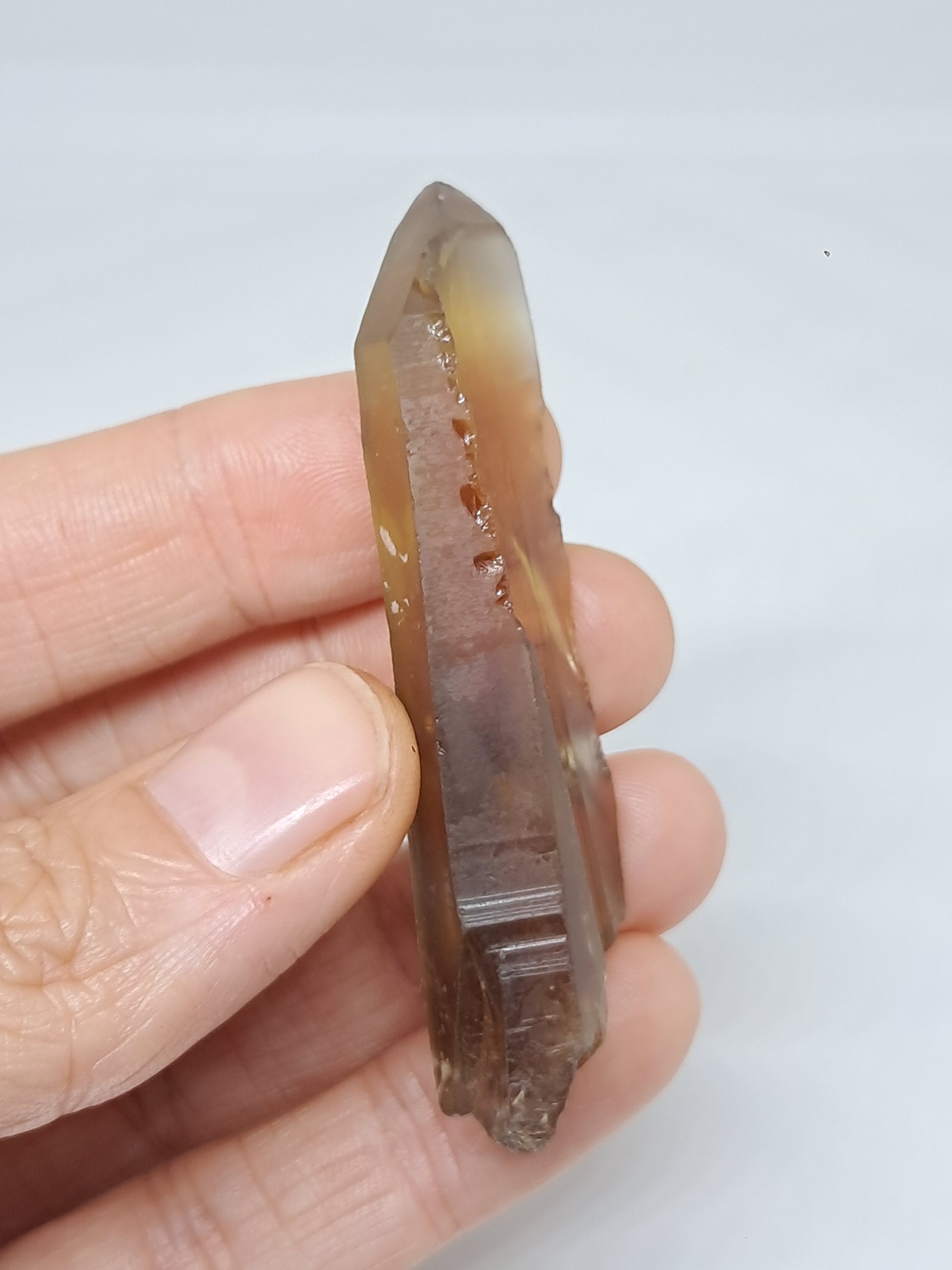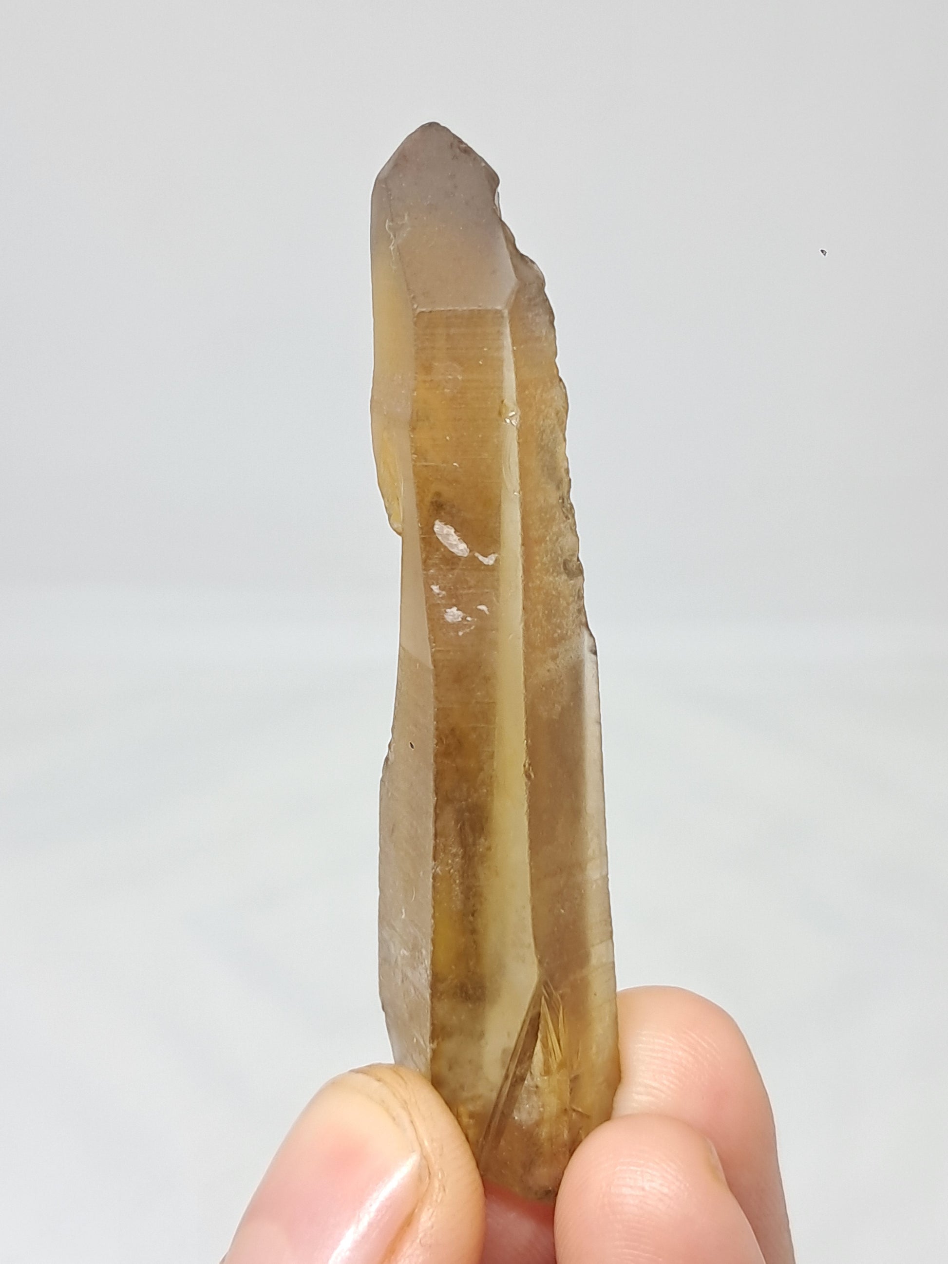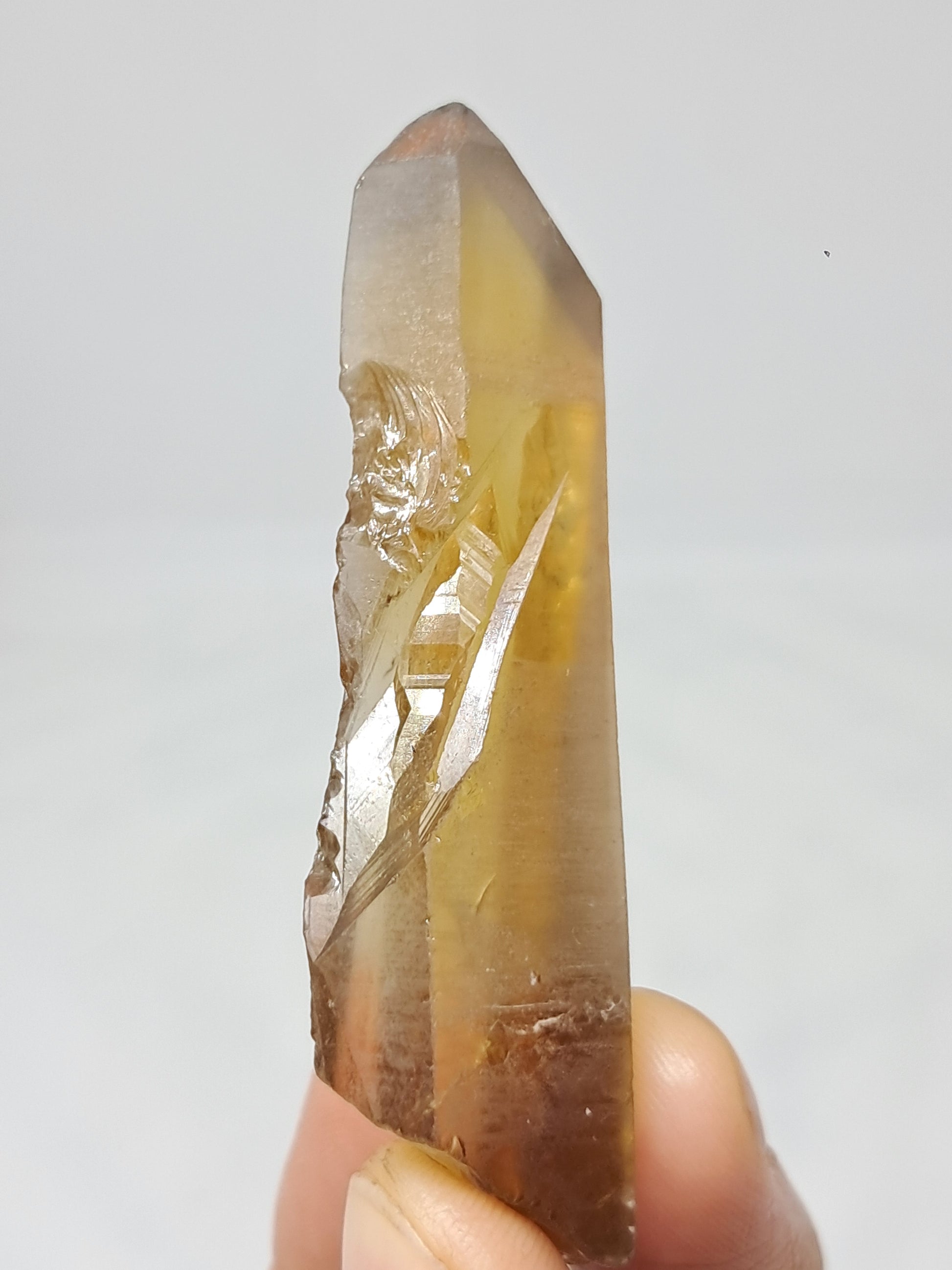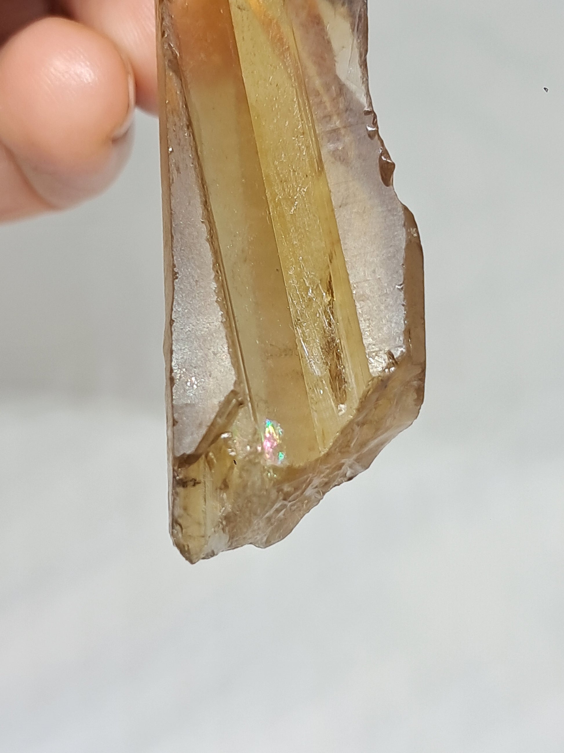 This natural citrine crystal (non heat-treated) displays warm honey-gold tones with subtle smoky shades. It has imprints along both sides and an inner rainbow on its base.