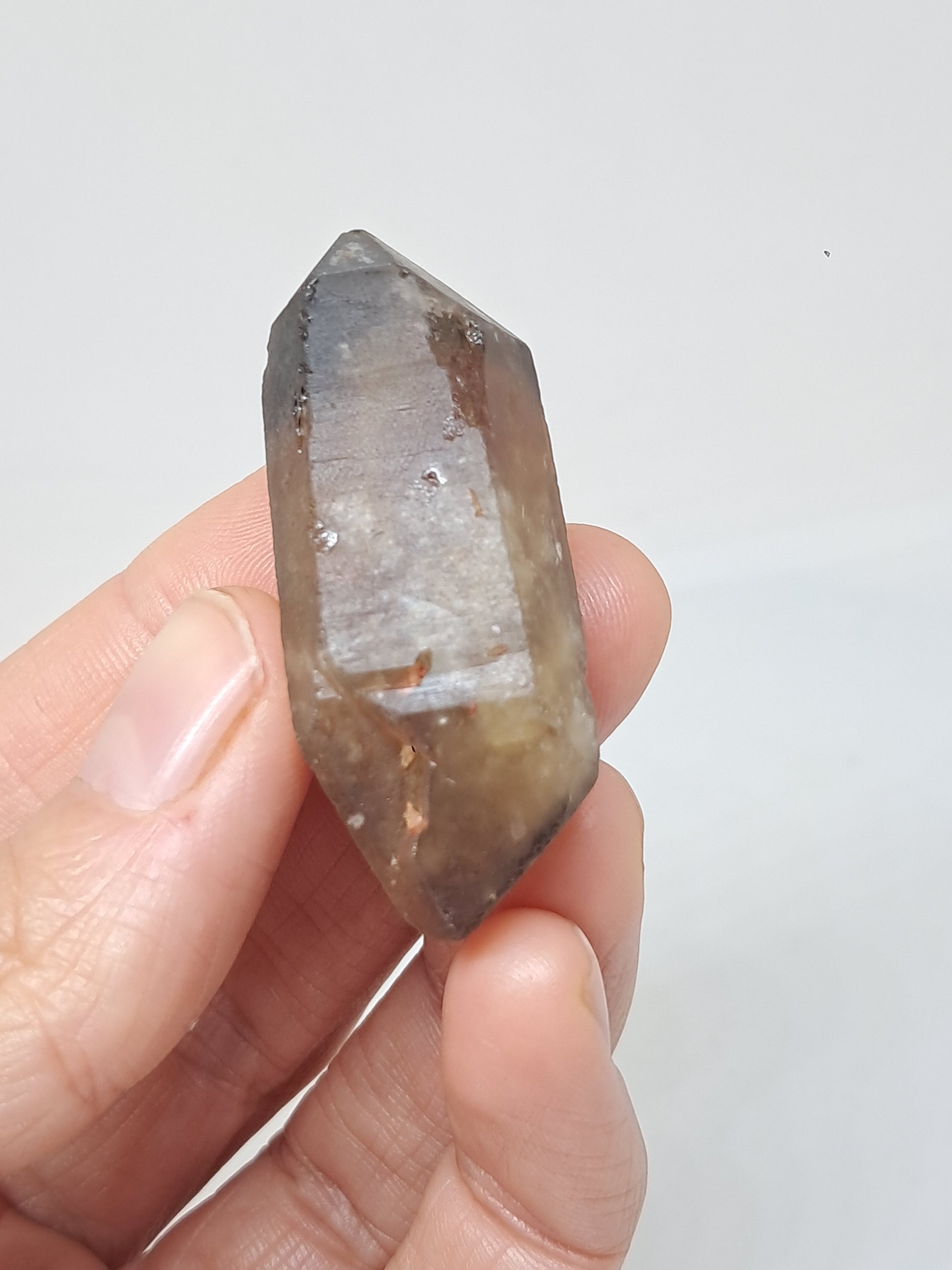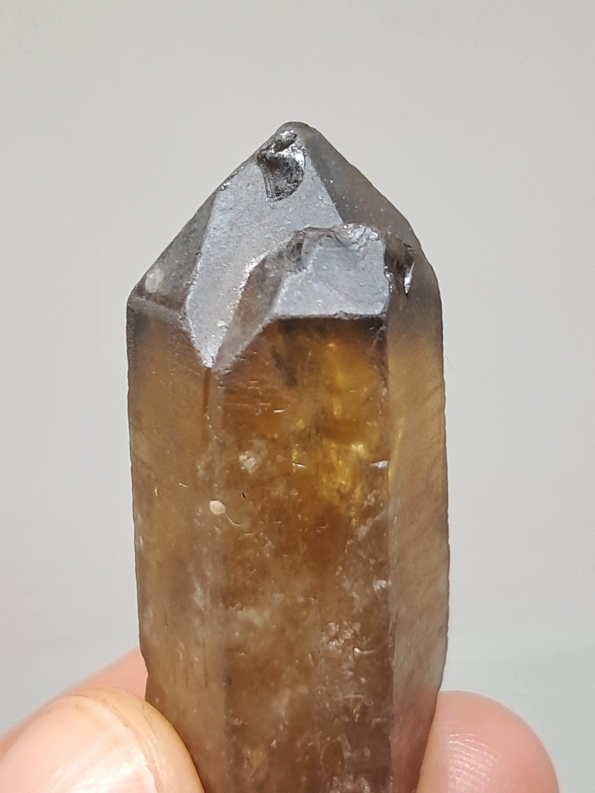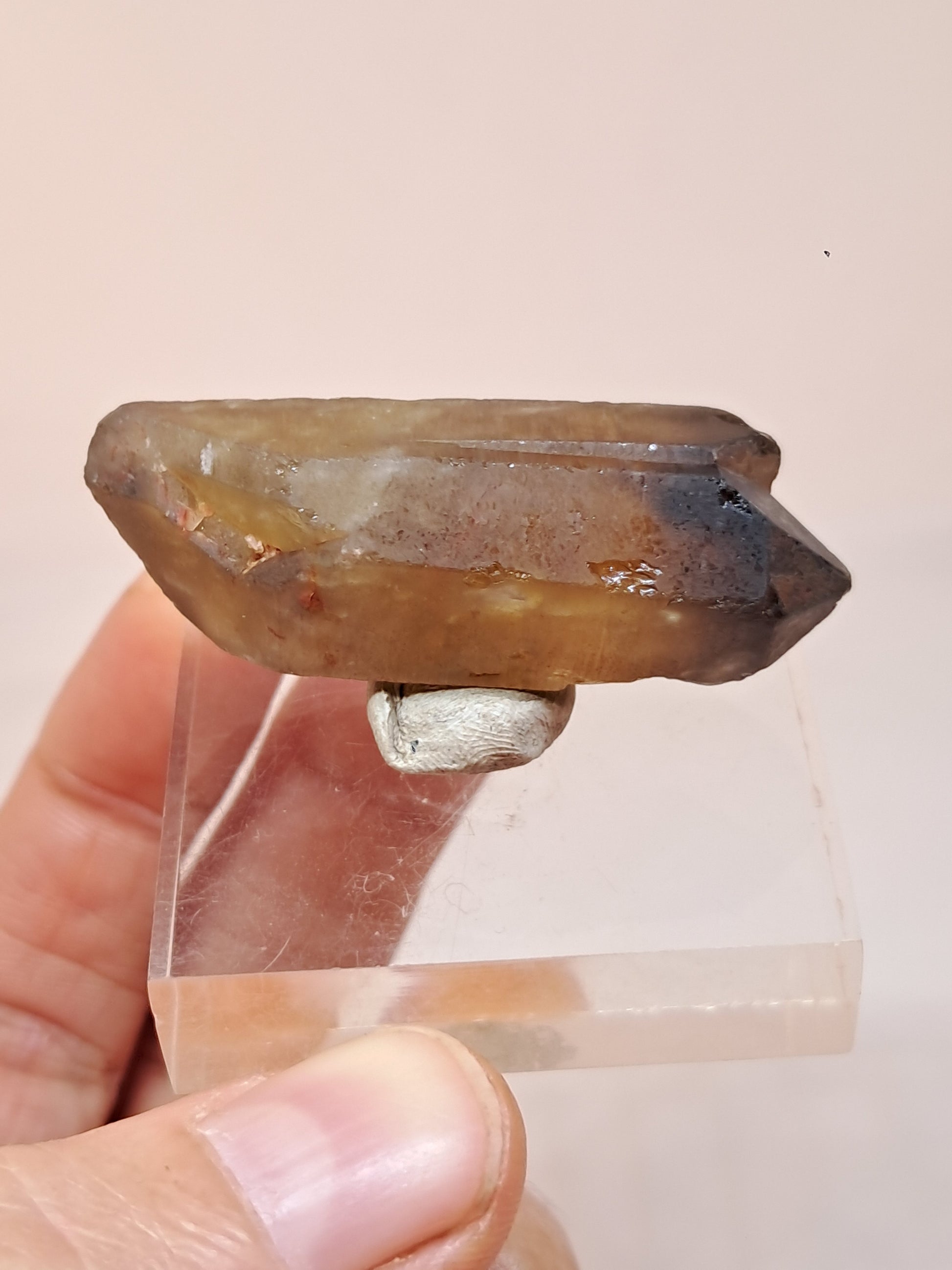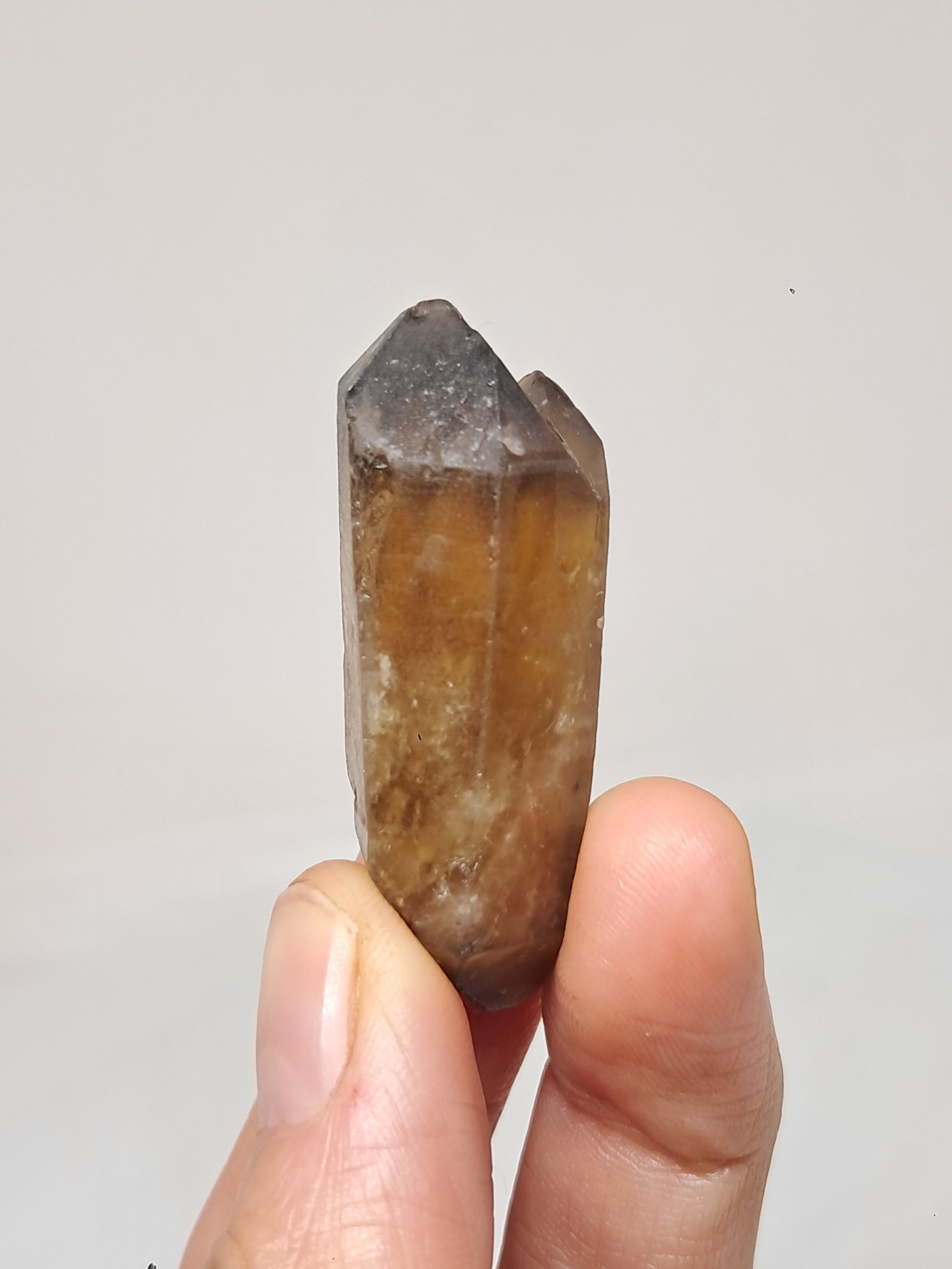 This natural Citrine crystal (non heat-treated) displays warm honey-gold tones with subtle smoky shades and iron-rich inclusions. It is biterminated, with a double termination in one of its sides. Some damage is visible, but it remains in pretty good state.