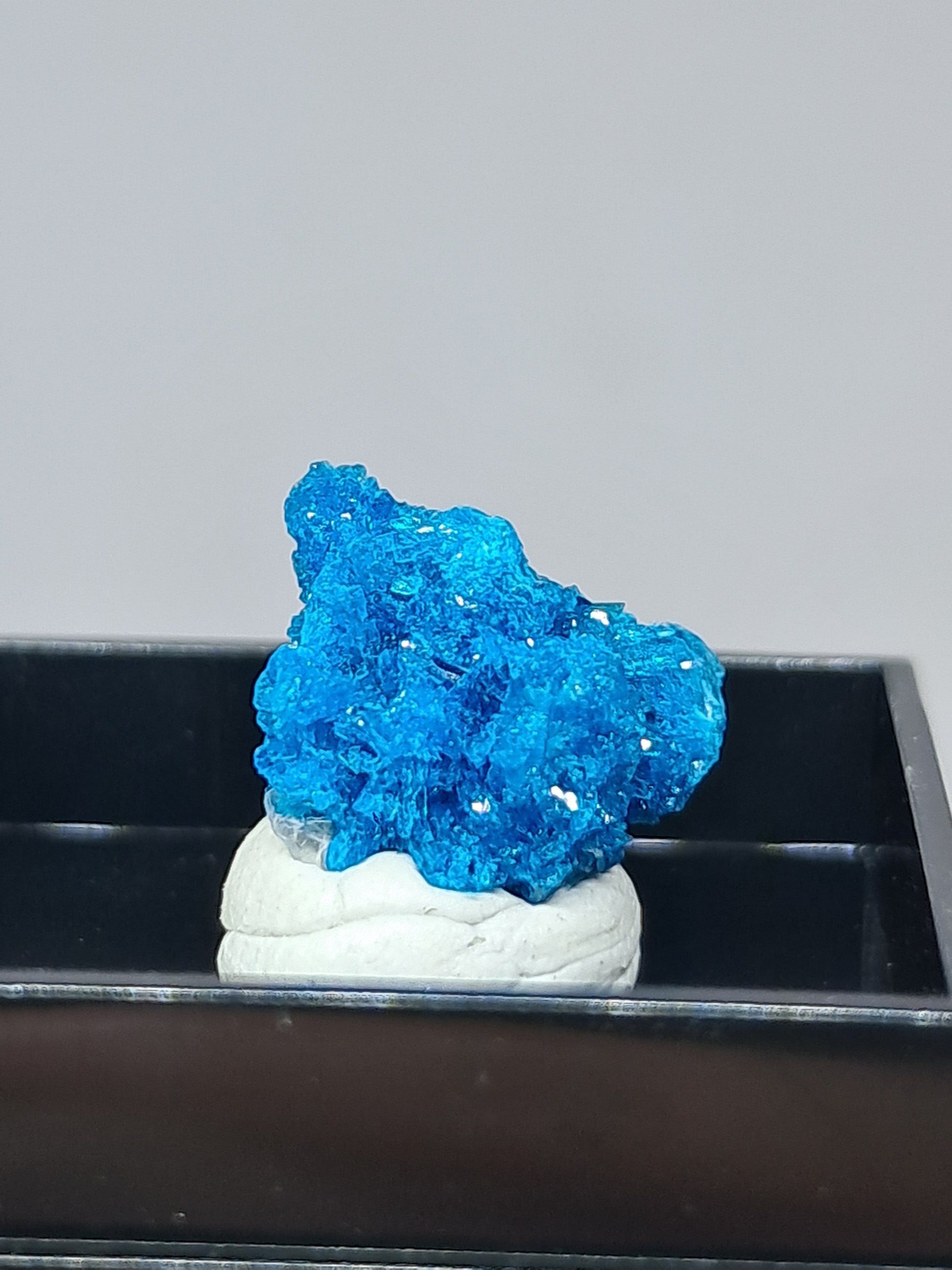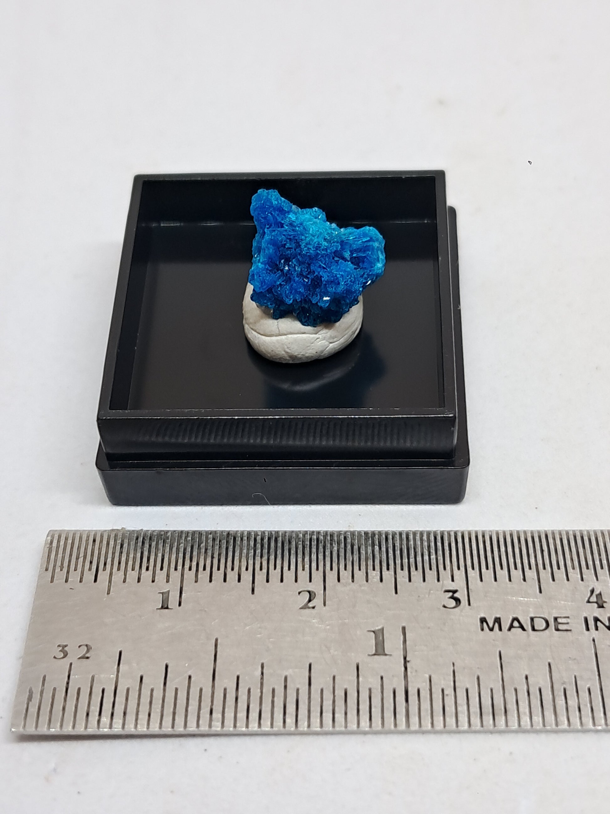 Beautiful specimen of shiny Pentagonite. It has some damage, but you can still spot many unbroken crystals. It is temporarily mounted in acrylic box (box is included).