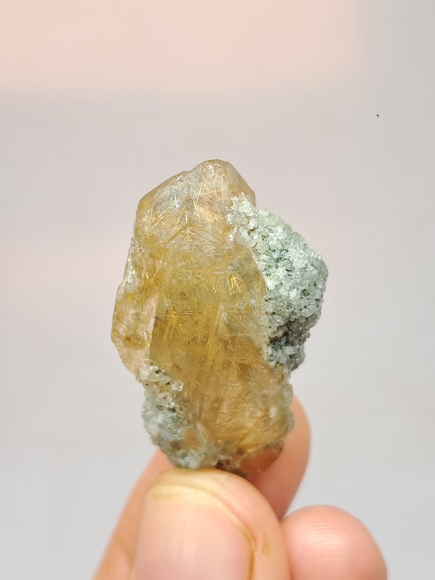 This is specimen shows inclusion of Chlorite and also shiny Rutile.