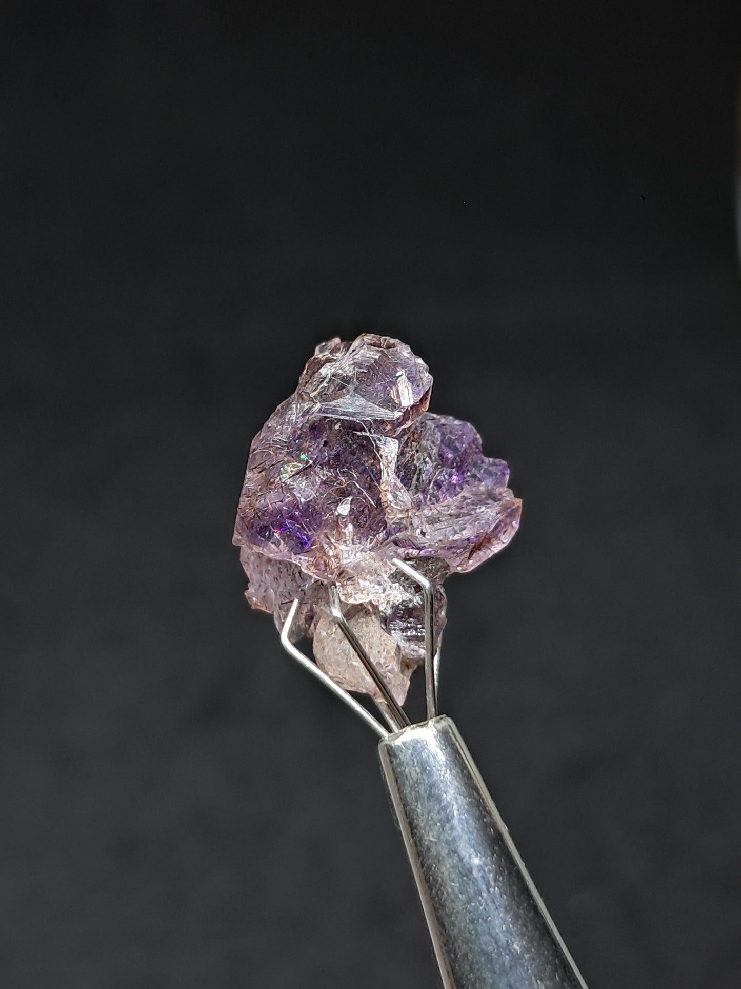This set includes three small specimens of Super Seven Amethyst, one being a cluster and two having elestial formation with some damages. All three have great shine, beautiful color and very noticeable inclusions. One specimen has a beautiful rainbow inside.