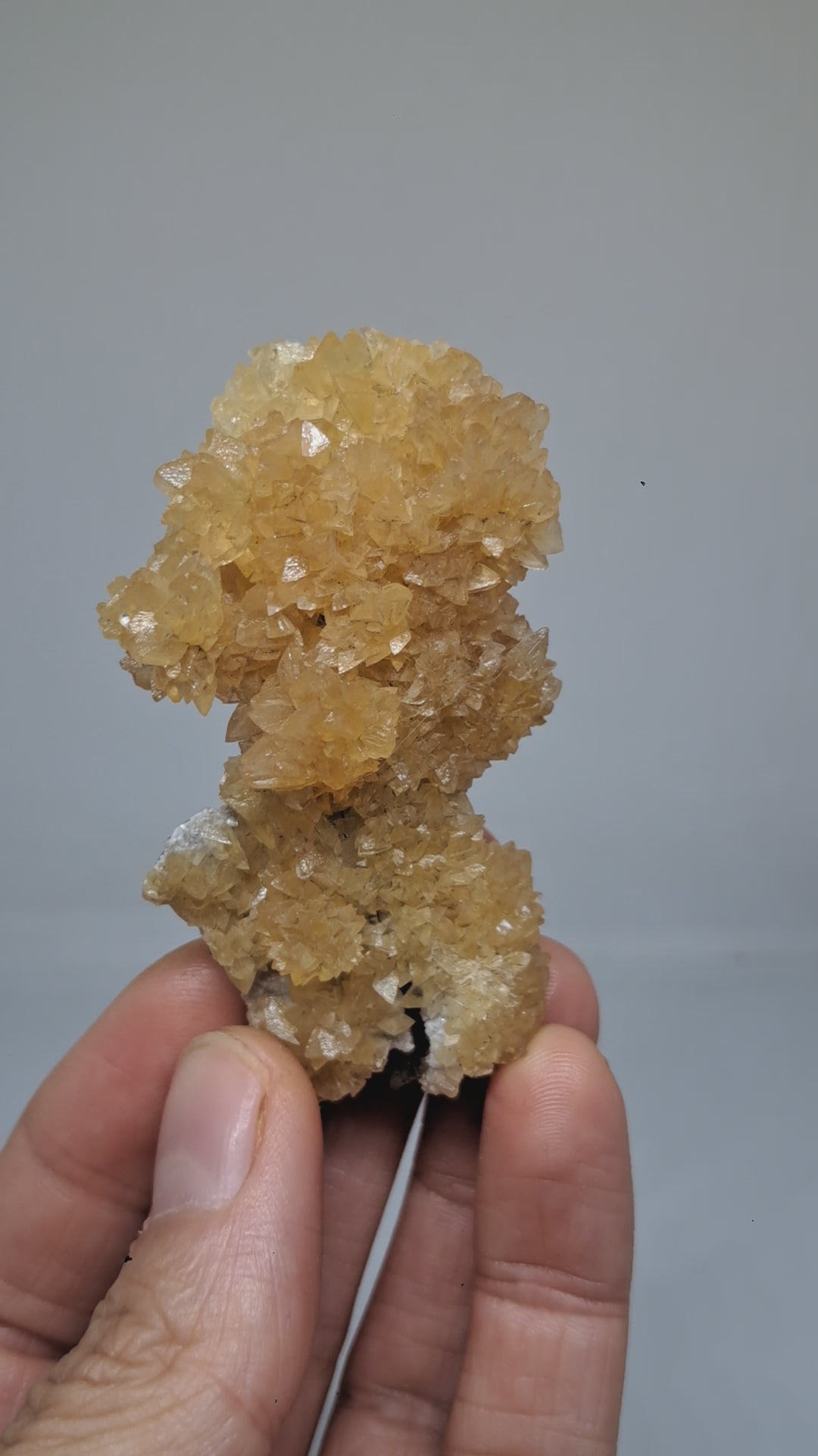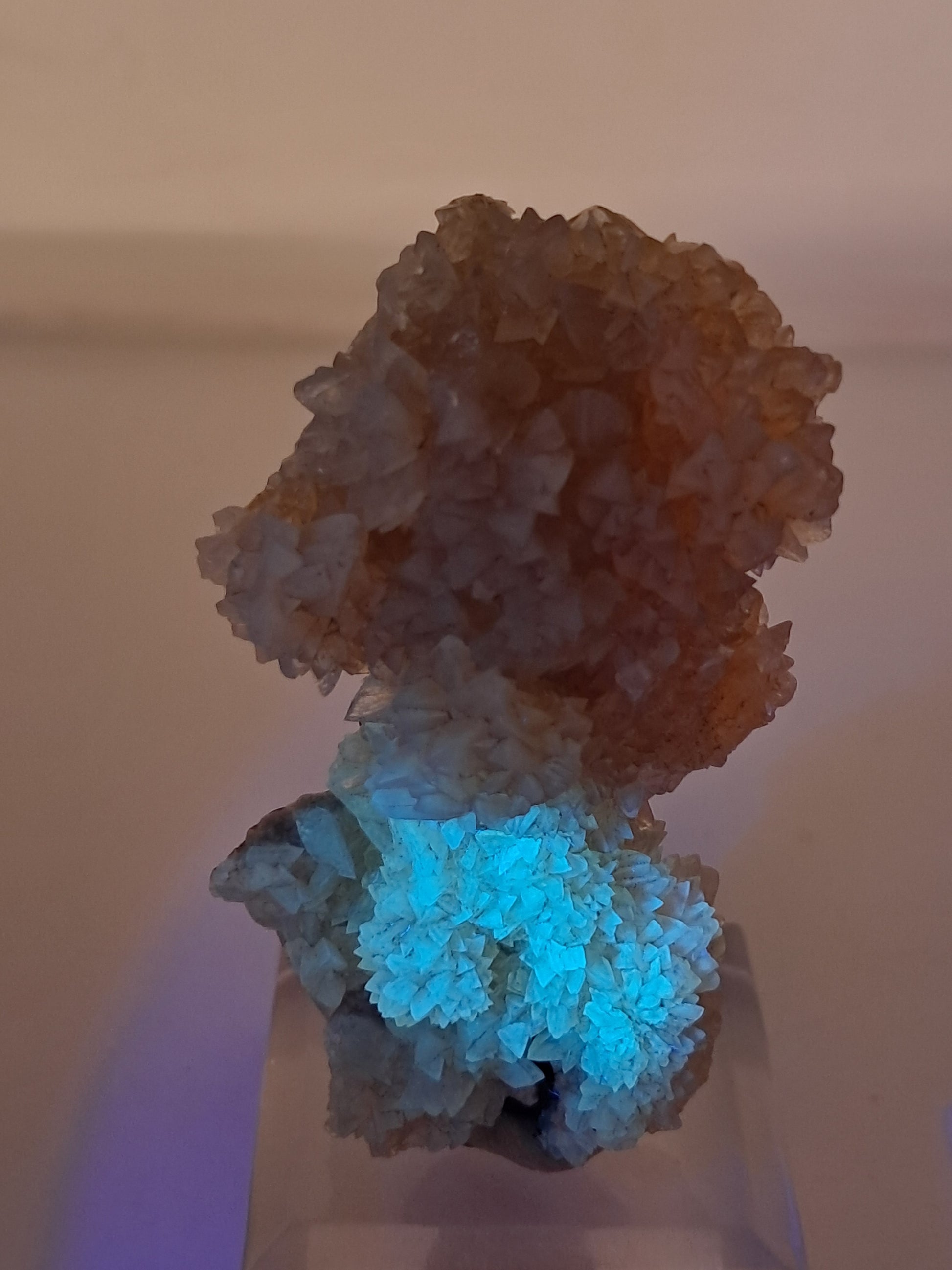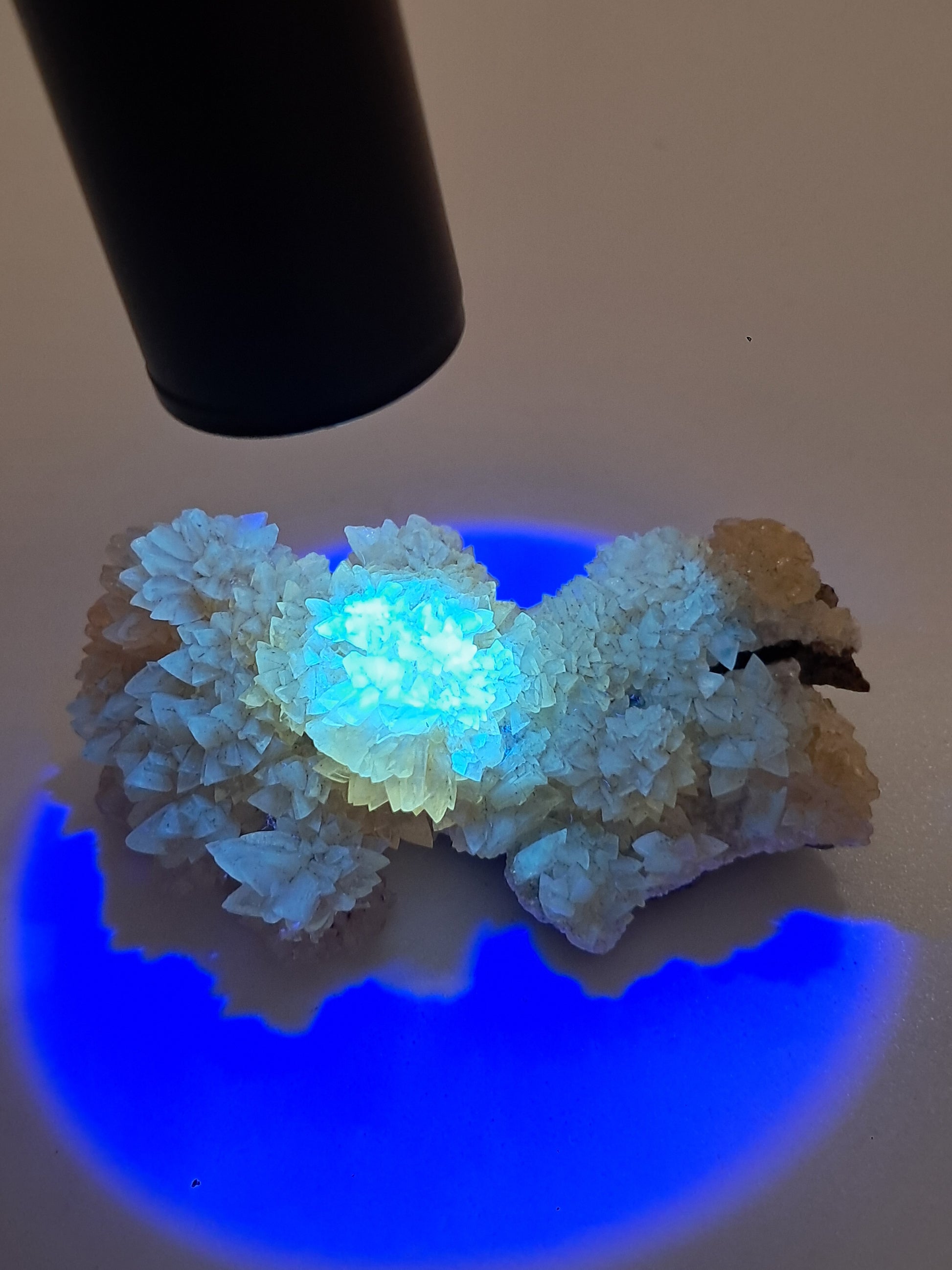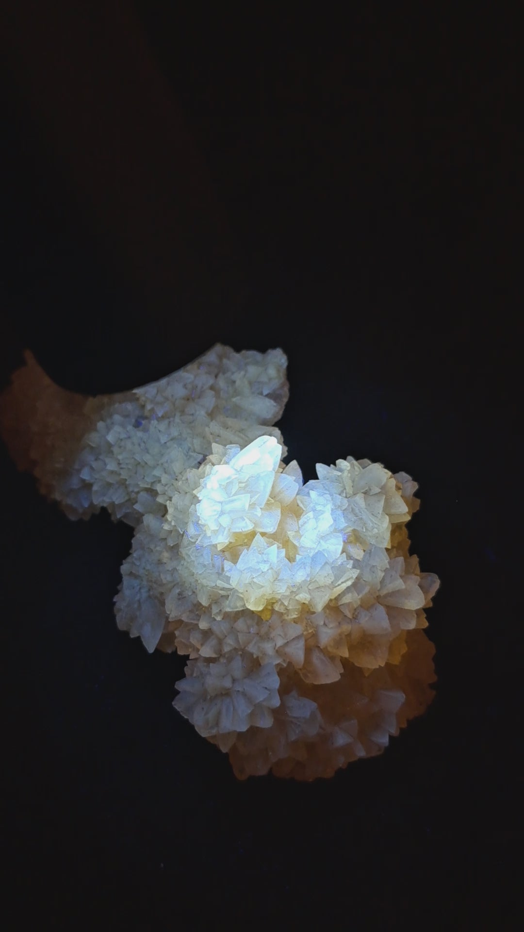 Yellow Calcite cluster with "dog tooth" formation. The Calcite crystals are glowing under uv light, they are actually phosphorescent crystals as they continue to glow for few seconds. This phenomenon is known as phosphorescence, a specific type of luminescence where materials store energy and release it slowly.